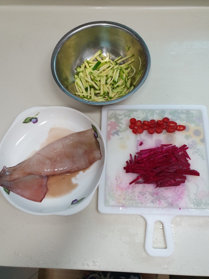 준비물 ㅡ 물오징어1마리, 부추, 쪽파, 비트, 홍고추, 찐옥수수, 대파, 마늘, 적양파, 호박, 부침가루(포도씨유,소금)