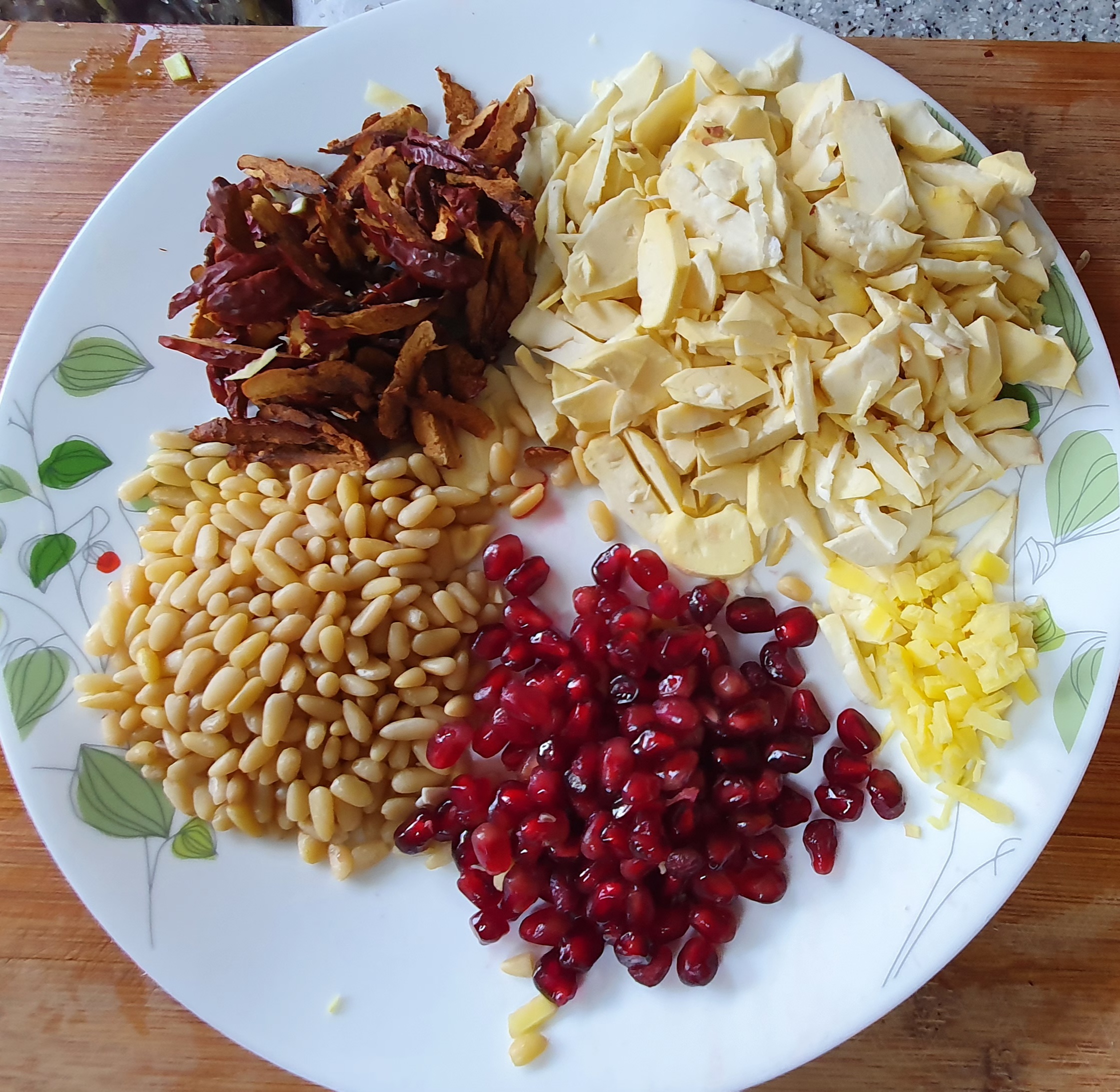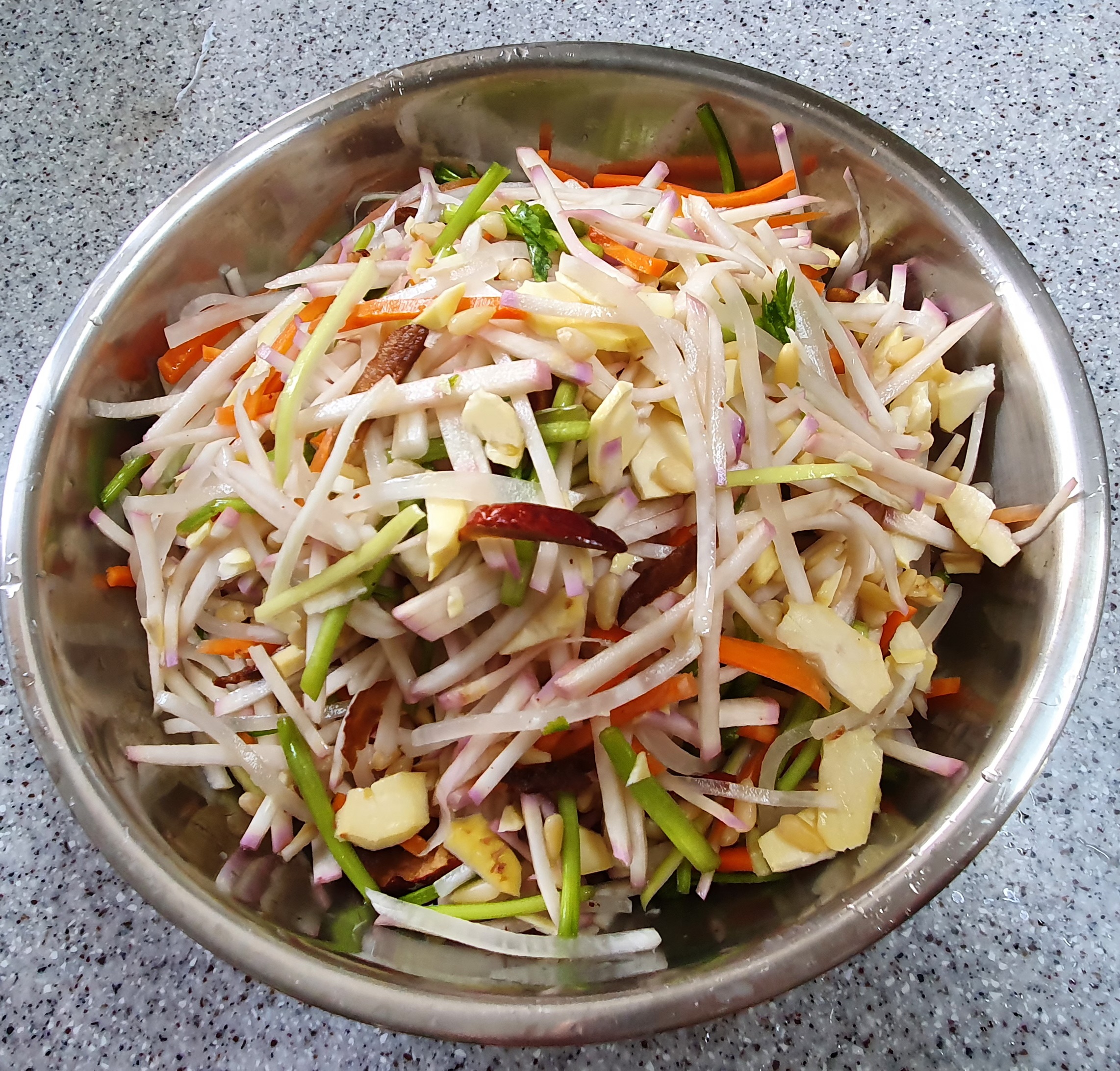 무우채, 순무채, 당근채, 밤, 대추, 잣을 섞어 줍니다.