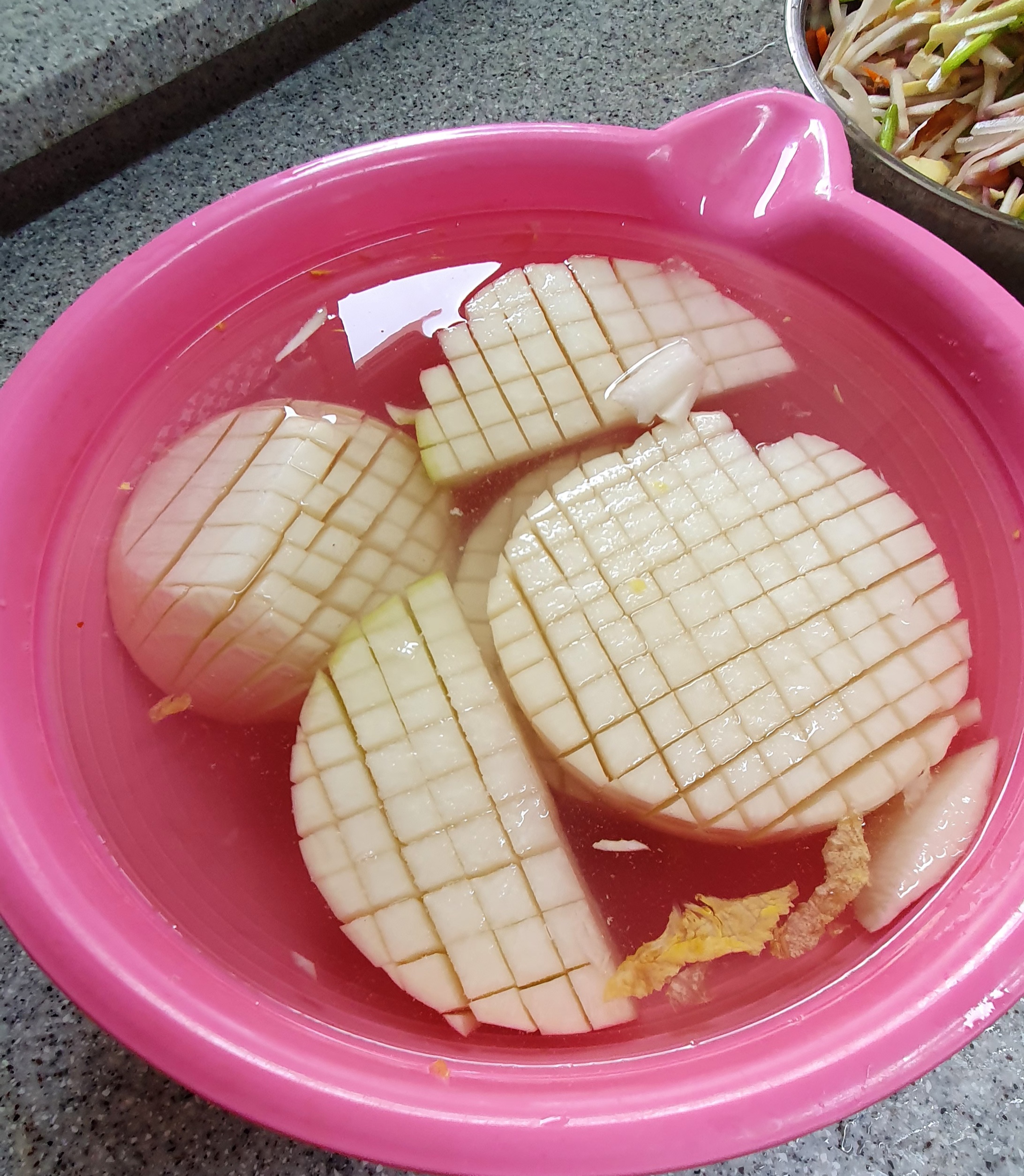 쪽파는 너무나 비싸서 못 가져 왔다네요 ㅠㅠ무우 3~4센치 크기로 4등분하여 칼집을 넣고 소금물에 담가 놓았네요