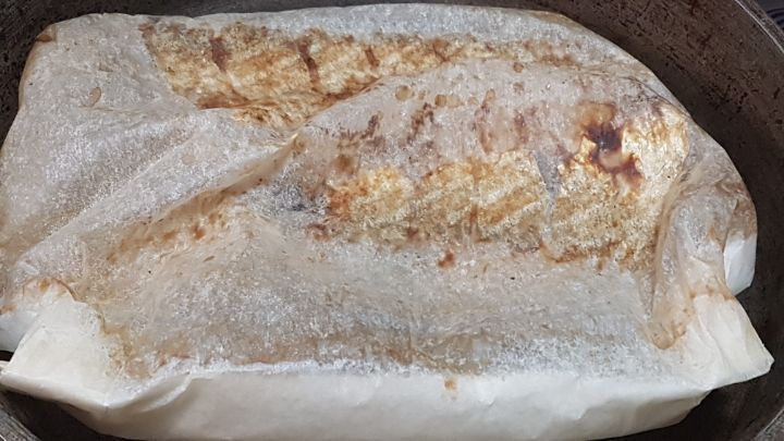 먼저 종이호일을 구울 생선의 아래, 위로 덮고 남을 정도로 자른 뒤,