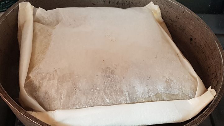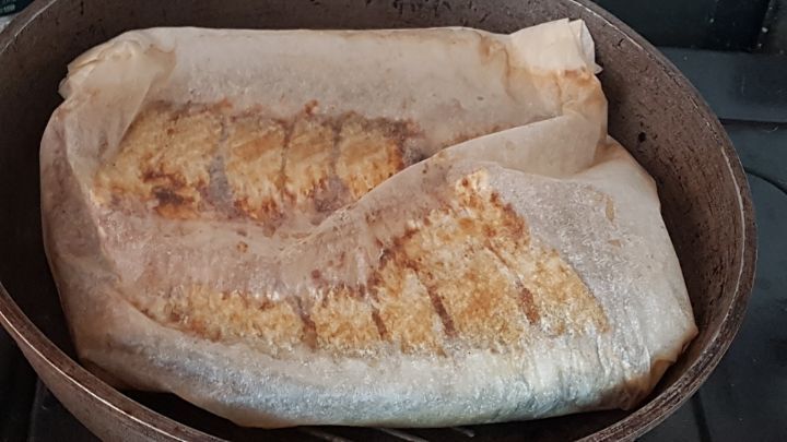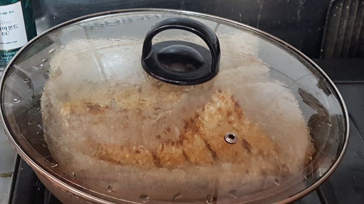 종이호일에 얹은 후, 종이호일을 반 접고 나머지 3면을 잘 접어 아무것도 바르지 않은 팬에 올리고 뚜껑 덮고 불은 중약불로.....