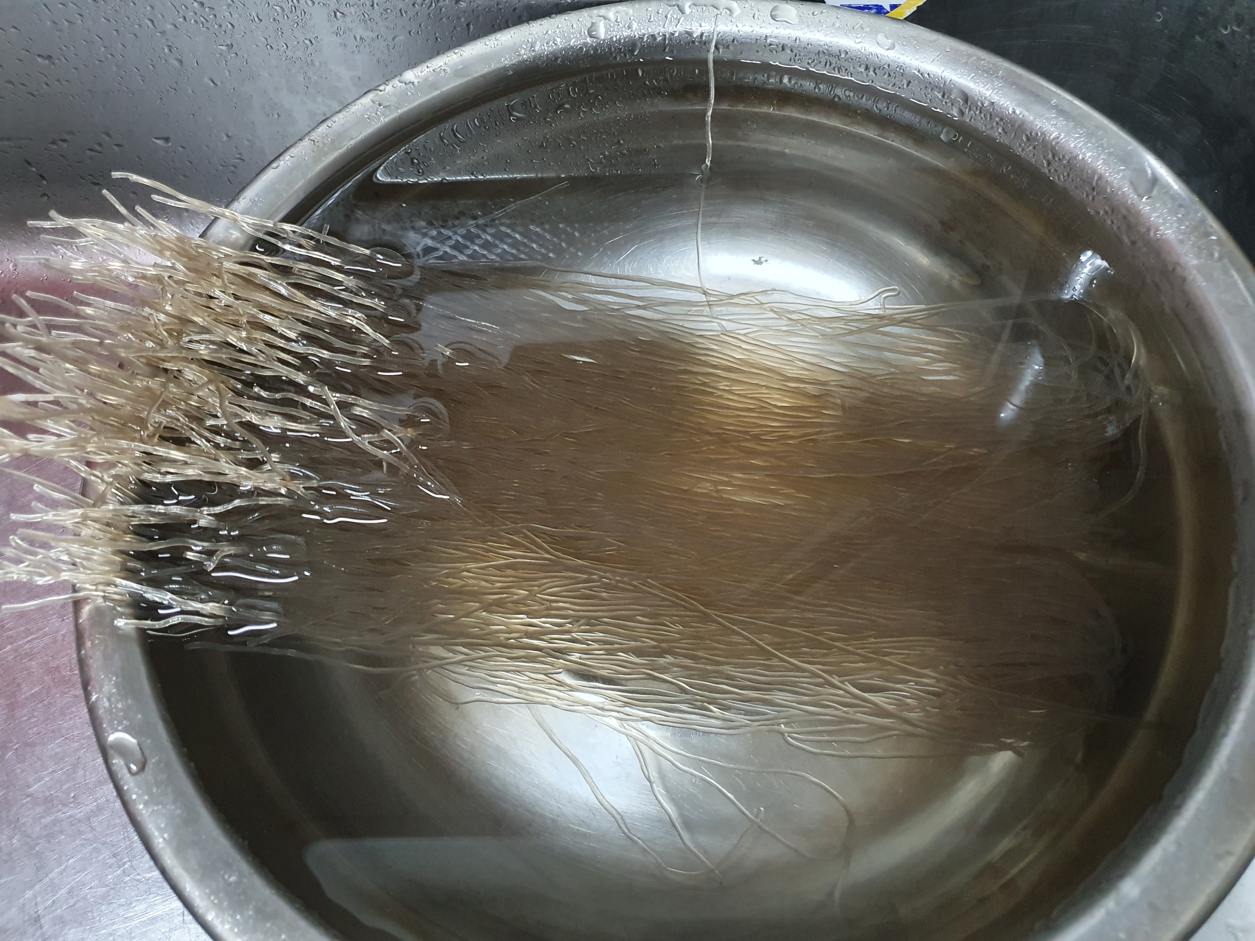 어젯밤에 담가 두었던 당면을 웍에 넣고