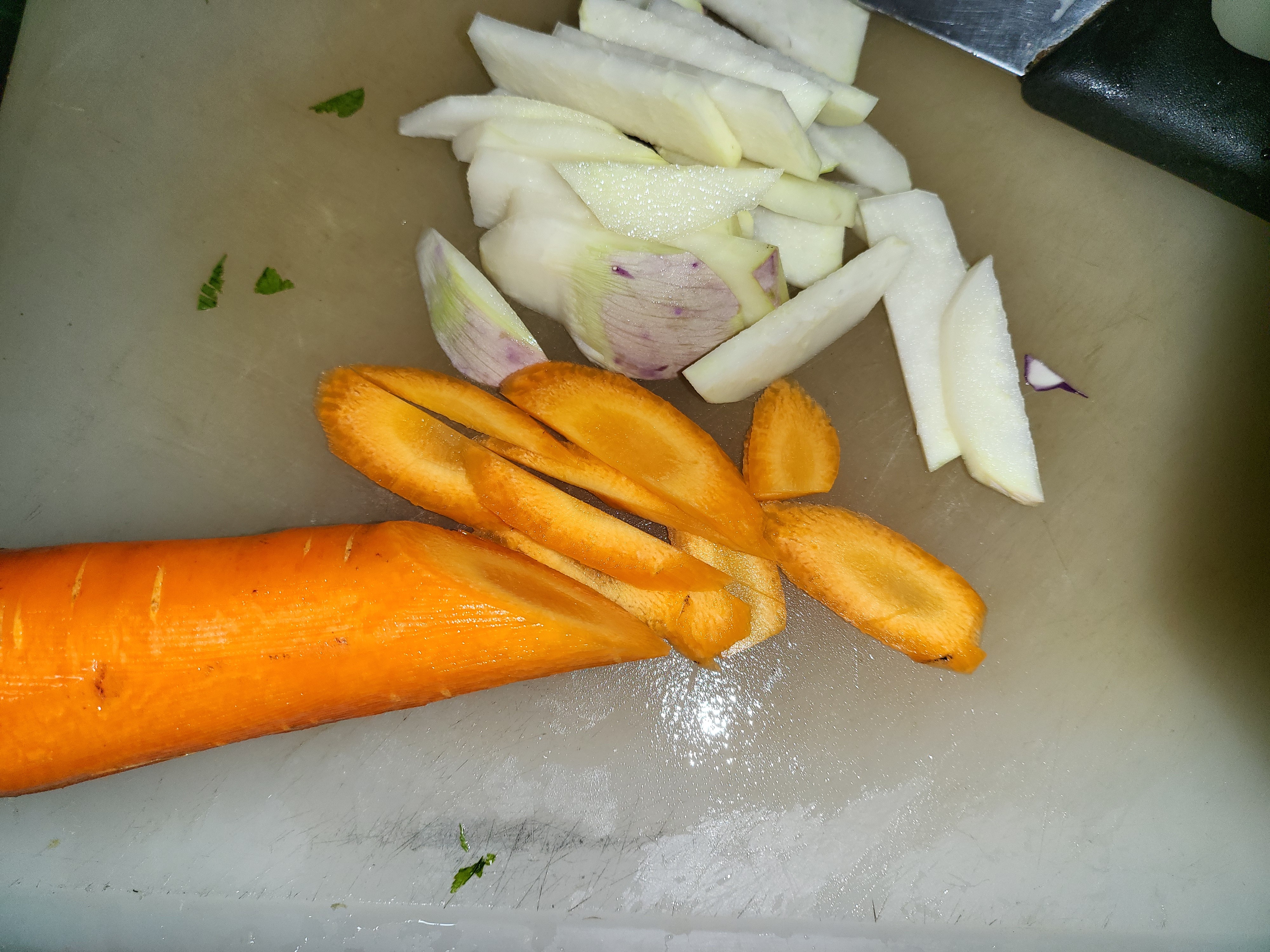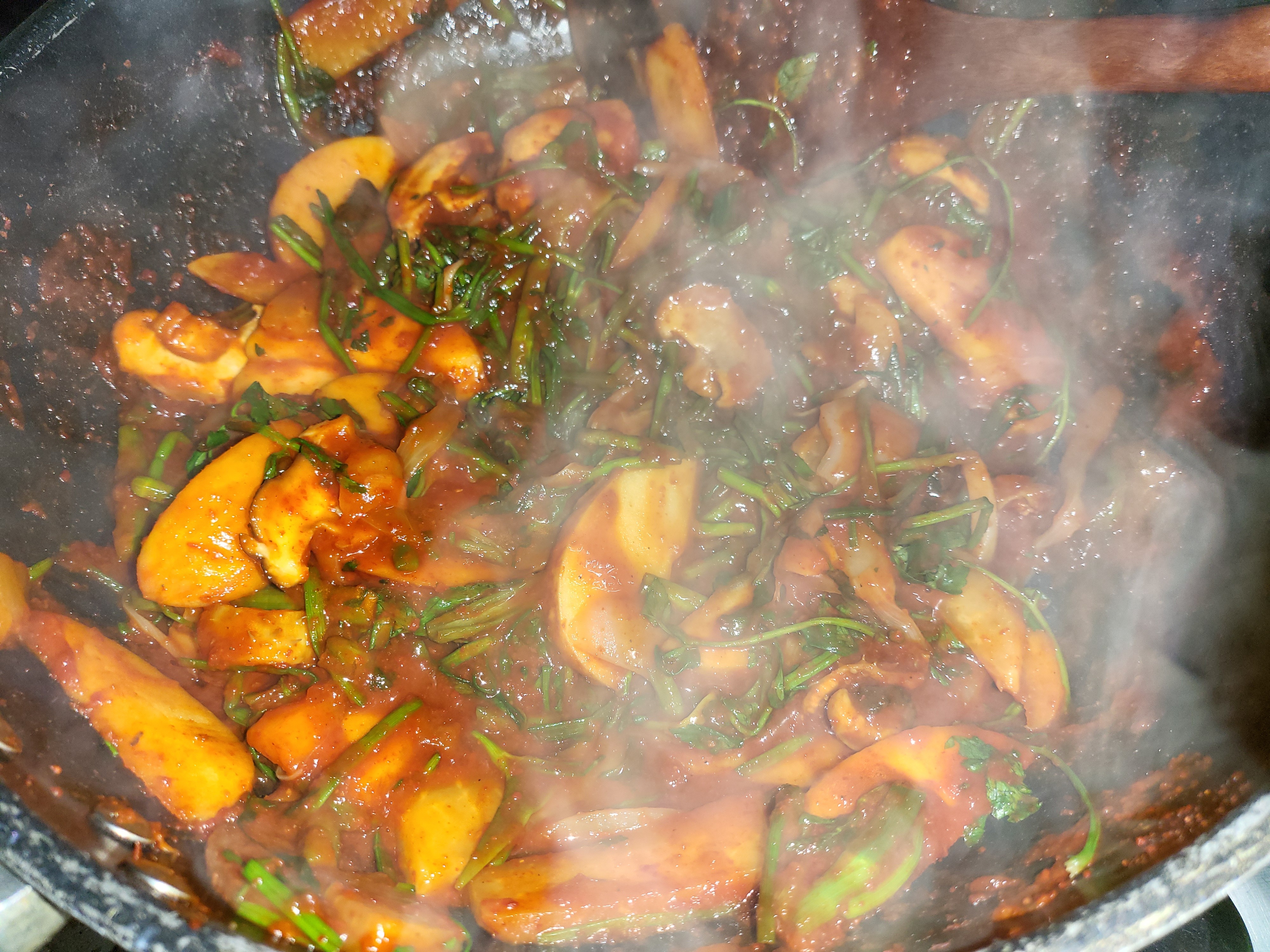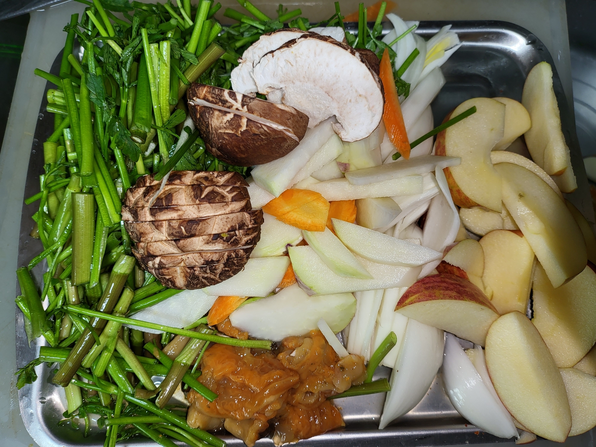 미나리(.....이건 많이) 버섯, 사과 작은 거 하나, 멍게나 미더덕 조금,
