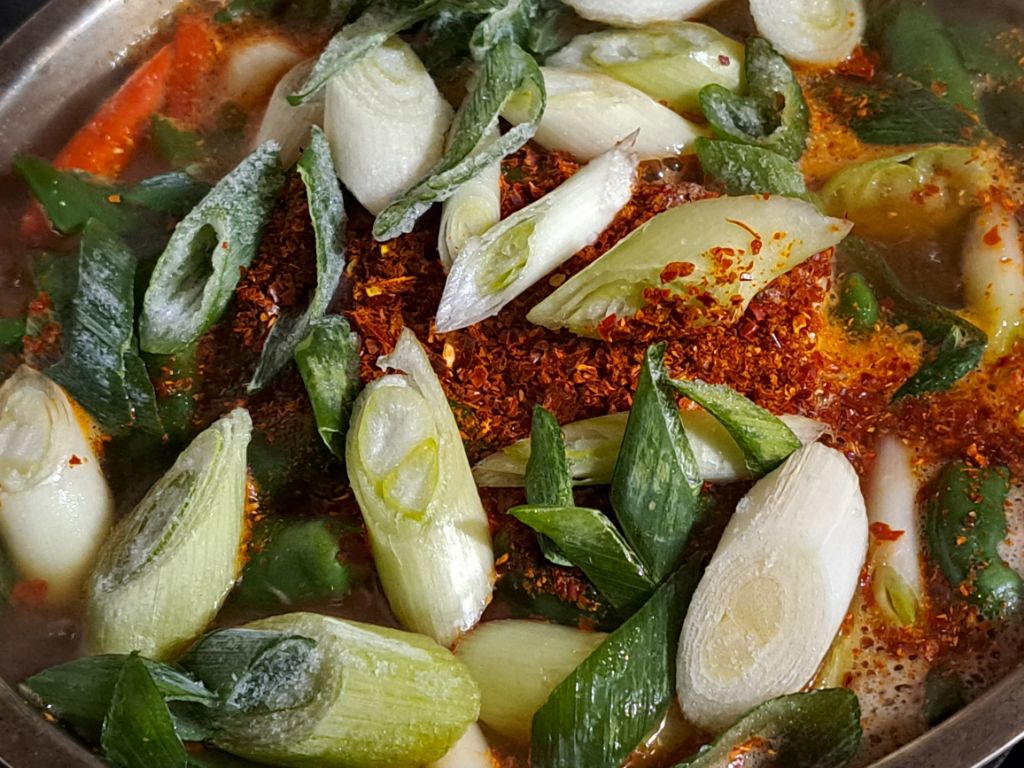 어슷 대파를 넣고 국물을 끼얹어 가며