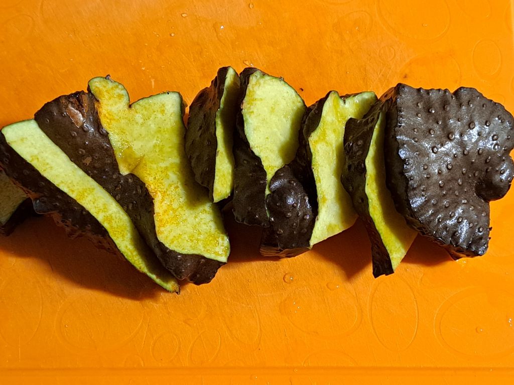 익혀 먹을 거라 껍질 째 넣었습니다만, 아니드만요.