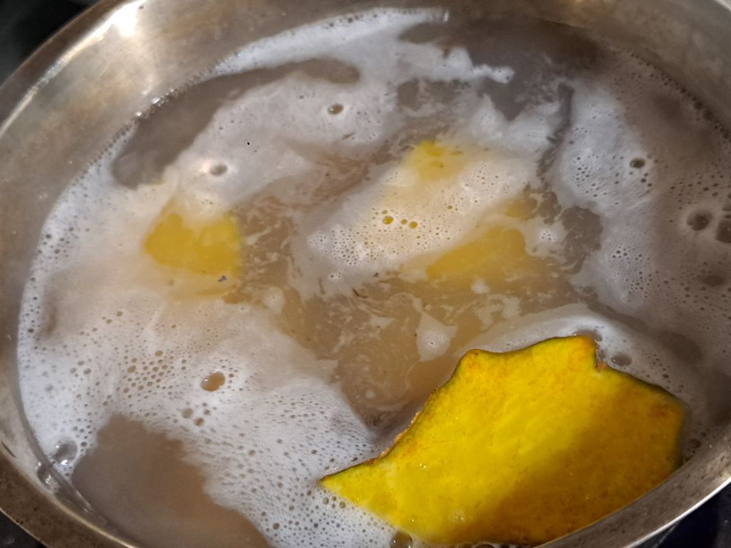 지질 냄비에 하늘마를 넣고 쌀뜨물을 어림잡아 붓고 끓을 때,