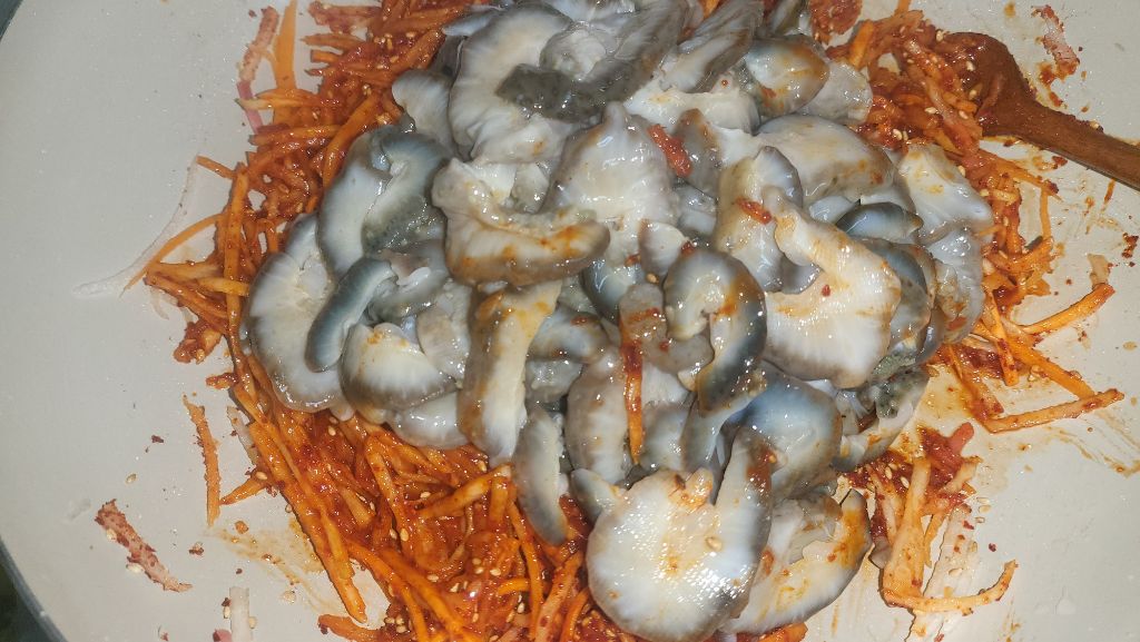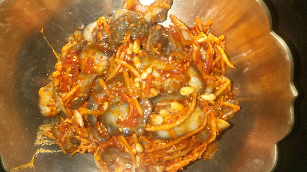 썰어놓은 해삼을 무채에 넣고 같이 버무립니다.