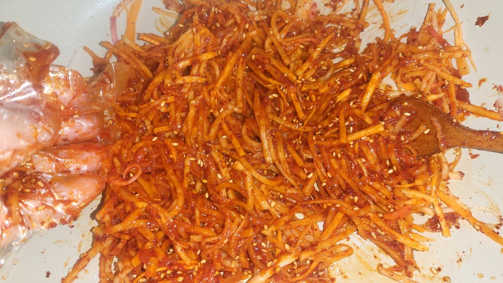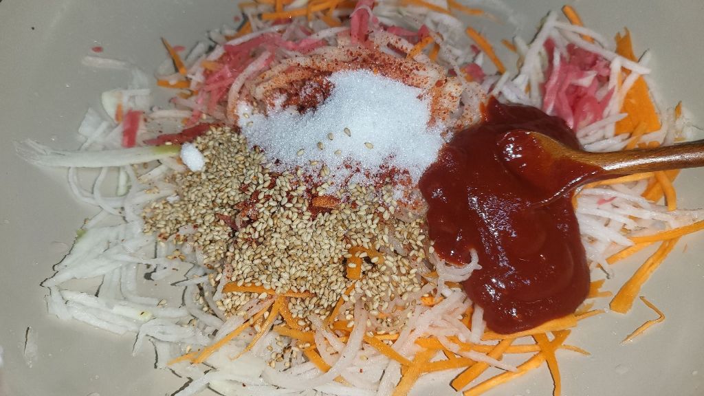 고춧가루, 통깨, 마늘, 고추장, 액젓, 설탕을 넣고 무채를 맛있게 무칩니다.