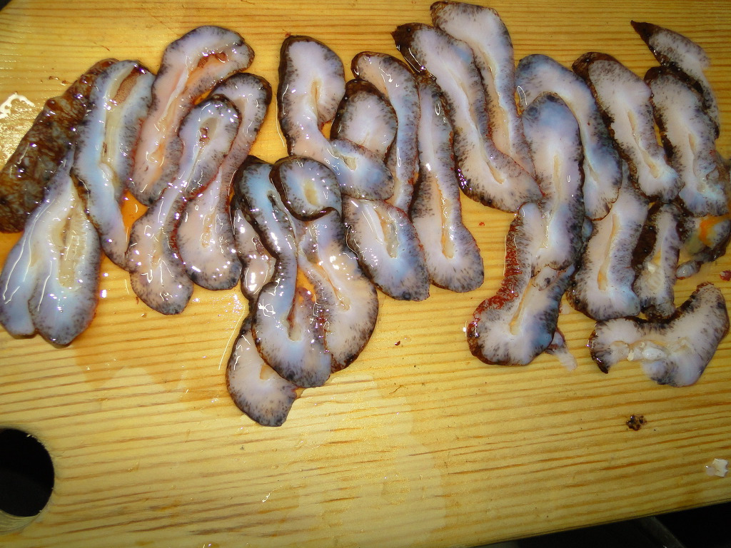 해삼은 구부러진 것을 펴주고 썰어야 합니다.