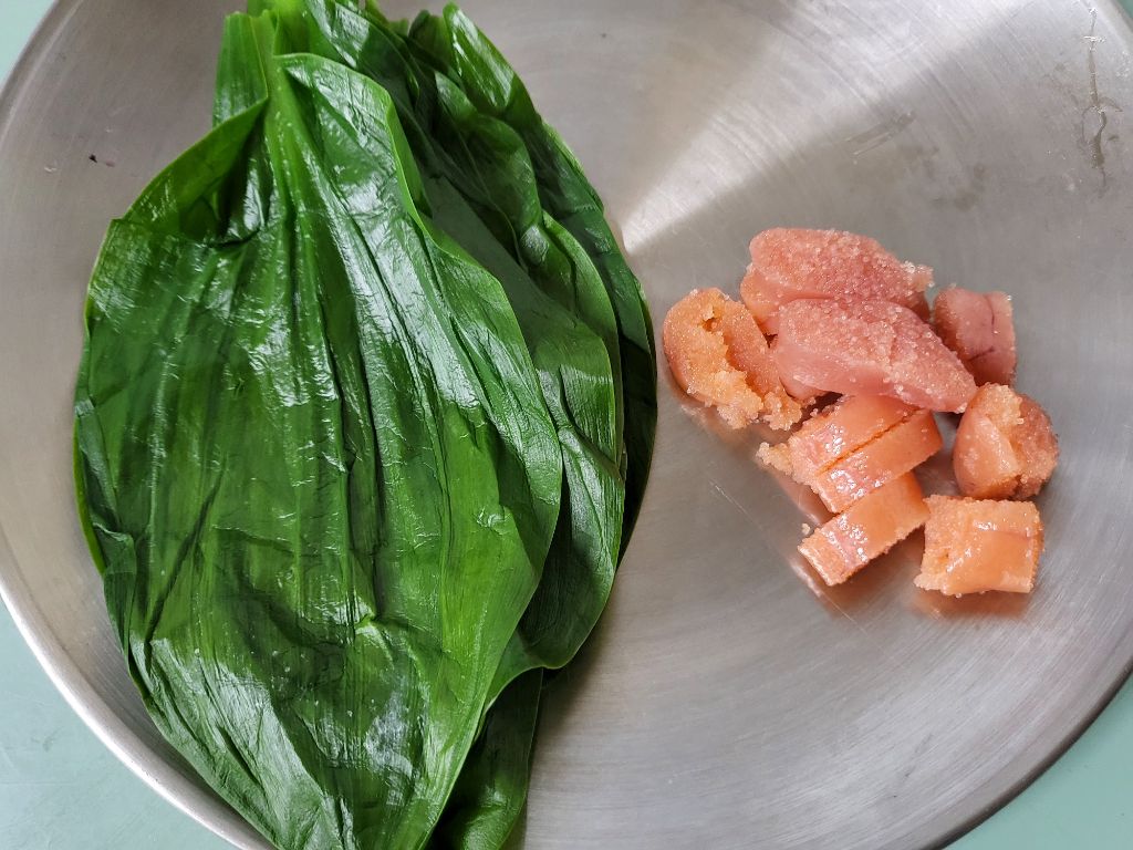 쪼물 쪼물 명이위에 올리고 명란젓