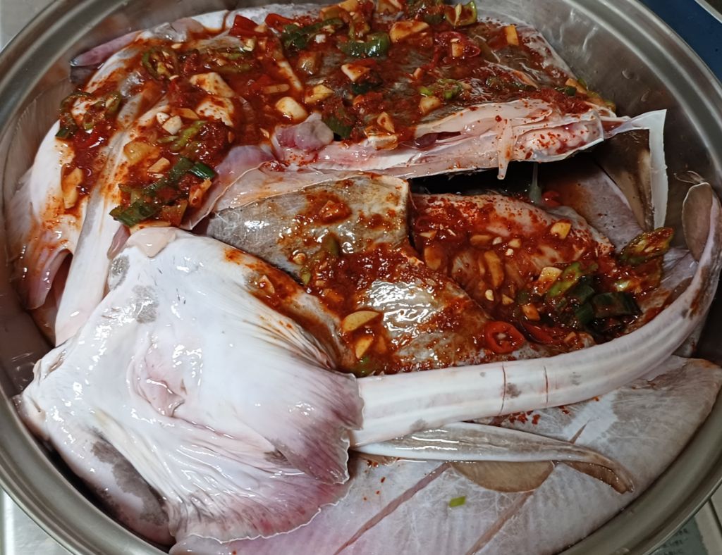 간재미에 칼 집 넣어