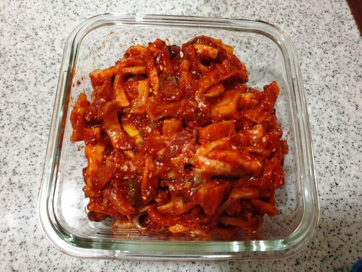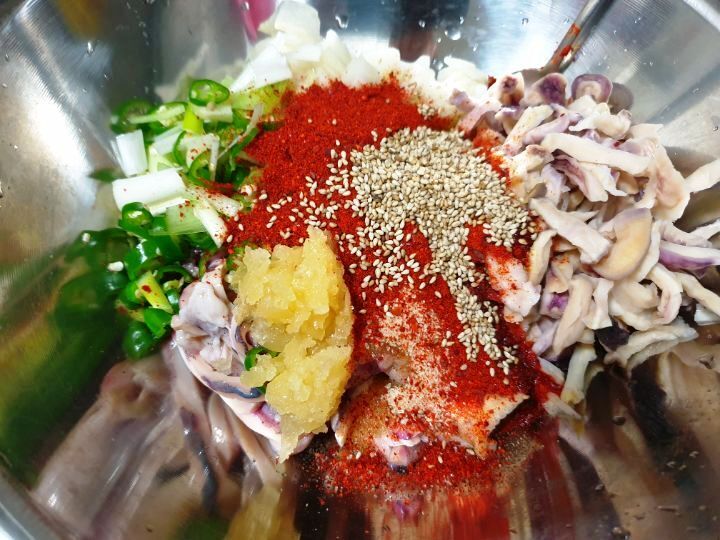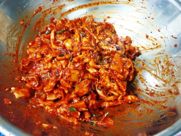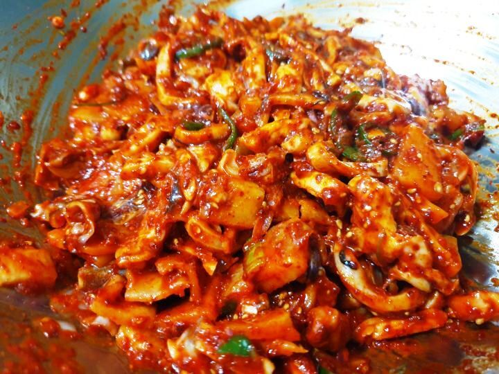 양념이 야채나 오징어에 맛이 들어야 해서 하루정도 냉장고에 넣어 두시면 더 맛날듯합니다.