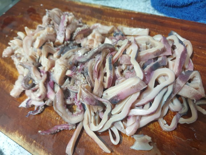 일단 소금에 잘 절여진 오징어를 반을접어 길게 적당한 크기로