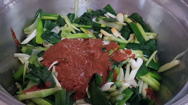 절여지는 동안, 찹쌀(멥쌀, 밀)가루로 풀을 쑤어(액젓 첨가) 식힌 데다가