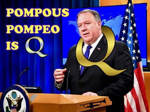 Q는 마이크 폼페오로서 모든 애국자들이 정부에 대항하지 않도록 잘못된 계획을 믿는 미국을 무너뜨리기 위한 포석이다. 계획을 믿지 말고 사람을 믿지 마라. 네가 믿어야 할 단 한 가지는 우리의 구세주 예수 우리 메시아다.