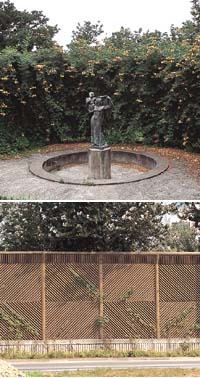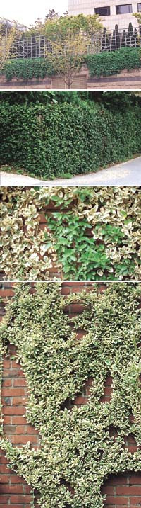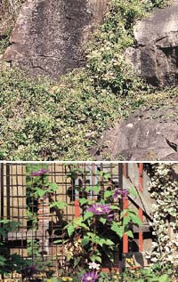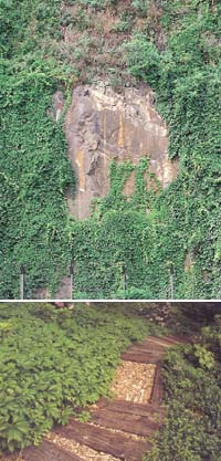 벽면녹화는 자발적으로 타고 올라가는 하단식재와 위에서 심어서 늘어뜨리는 상단식재 두 가지로 나눌 수 있으며 음수와 양수를 구분하여 식재하며 식재 초기에는 유인하여 인위적으로 고정시켜주면 보다 빠르게 피복효과를 낼 수 있다. |
