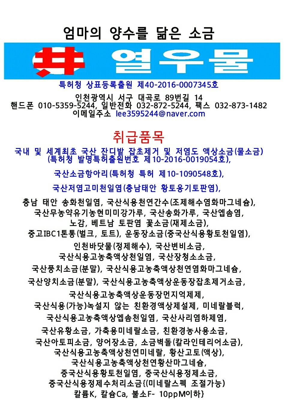 주종목을 소금으로 부종목 및 기타 종목을 전문유통하고 있습니다.