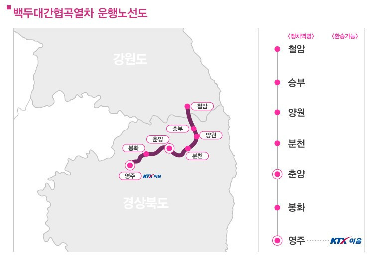 백두대간협곡열차의 첫차는 영주역에서부터 시작합니다. 영주를 시작으로 봉화, 춘양, 분천, 양원, 승부, 철암 사이를 지나는데요.