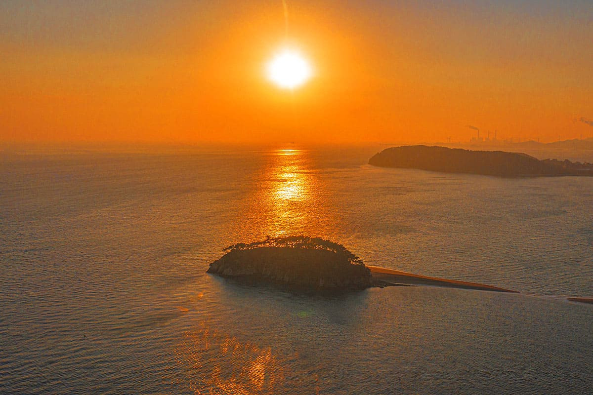 일몰 시간, 태양이 바다 끝으로 내려가면서 주변 갯벌과 섬들이 오렌지빛으로 물들어 가는 풍경은 그 자체로 마음의 여유를 선사합니다.