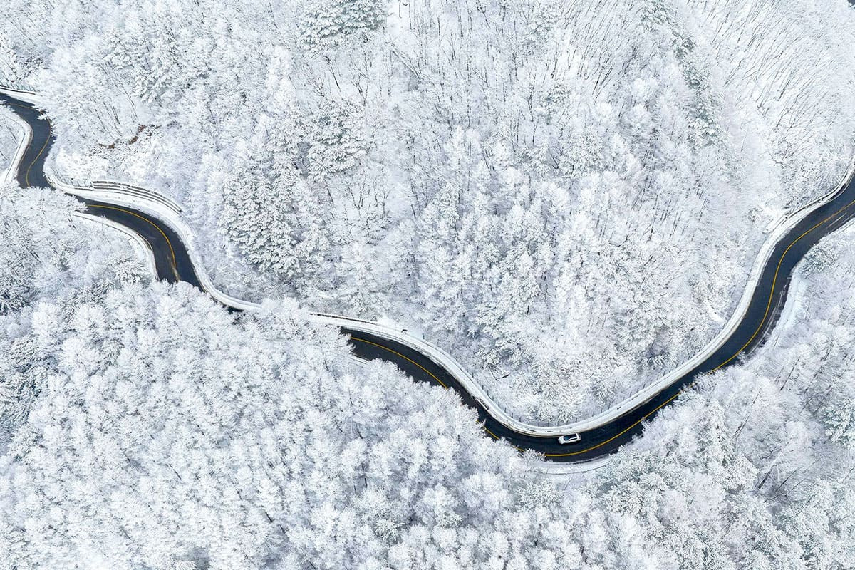 이곳은 고도가 높은 산길로 이어져 있어 눈 덮인 나무들과 도로가 어우러지는 장관을 감상할 수 있습니다.
