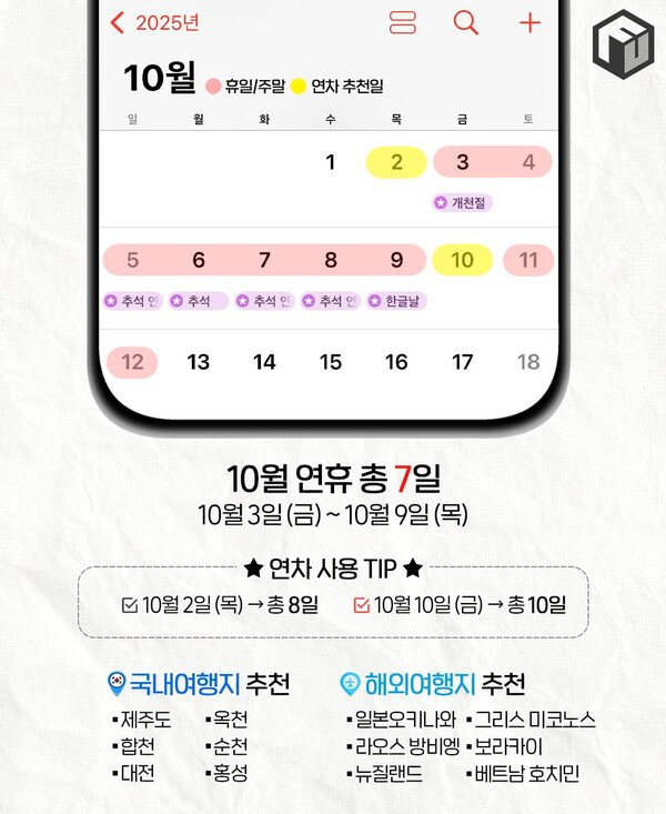 2025년 10월은 모두가 기다리는 추석 연휴가 있는 달입니다. 10월 3일 금요일 개천절을 시작으로 추석 연휴와 추석 대체 휴일, 10월 9일 한글날까지 주말을 포함해 총 7일의 연휴가 마련됩니다. 10월 10일 금요일에 연차를 사용하면 주말을 포함해 총 10일간의 연휴를 만끽할 수 있습니다.