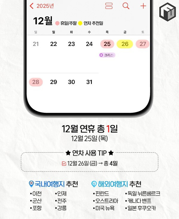2025년 12월 25일 목요일은 크리스마스입니다. 금요일을 사이에 두고 주말이 있어 12월 26일 금요일 연차를 사용하면 주말을 포함해 4일의 연휴를 마련할 수 있습니다.