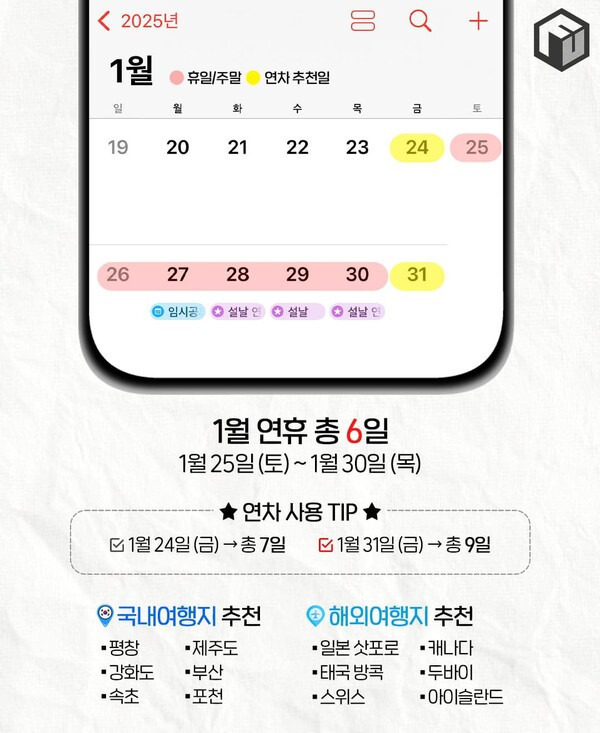 오늘 여행톡톡은 2025년 공휴일 달력과 2025 연차쓰기 좋은 날, 연휴가 있는 월별 추천하는 국내외 여행지까지 총정리해 소개했습니다. 여러분의 한 해 여행 계획에 도움이 되길 바랍니다. 모두 새해 복 많이 받으세요!