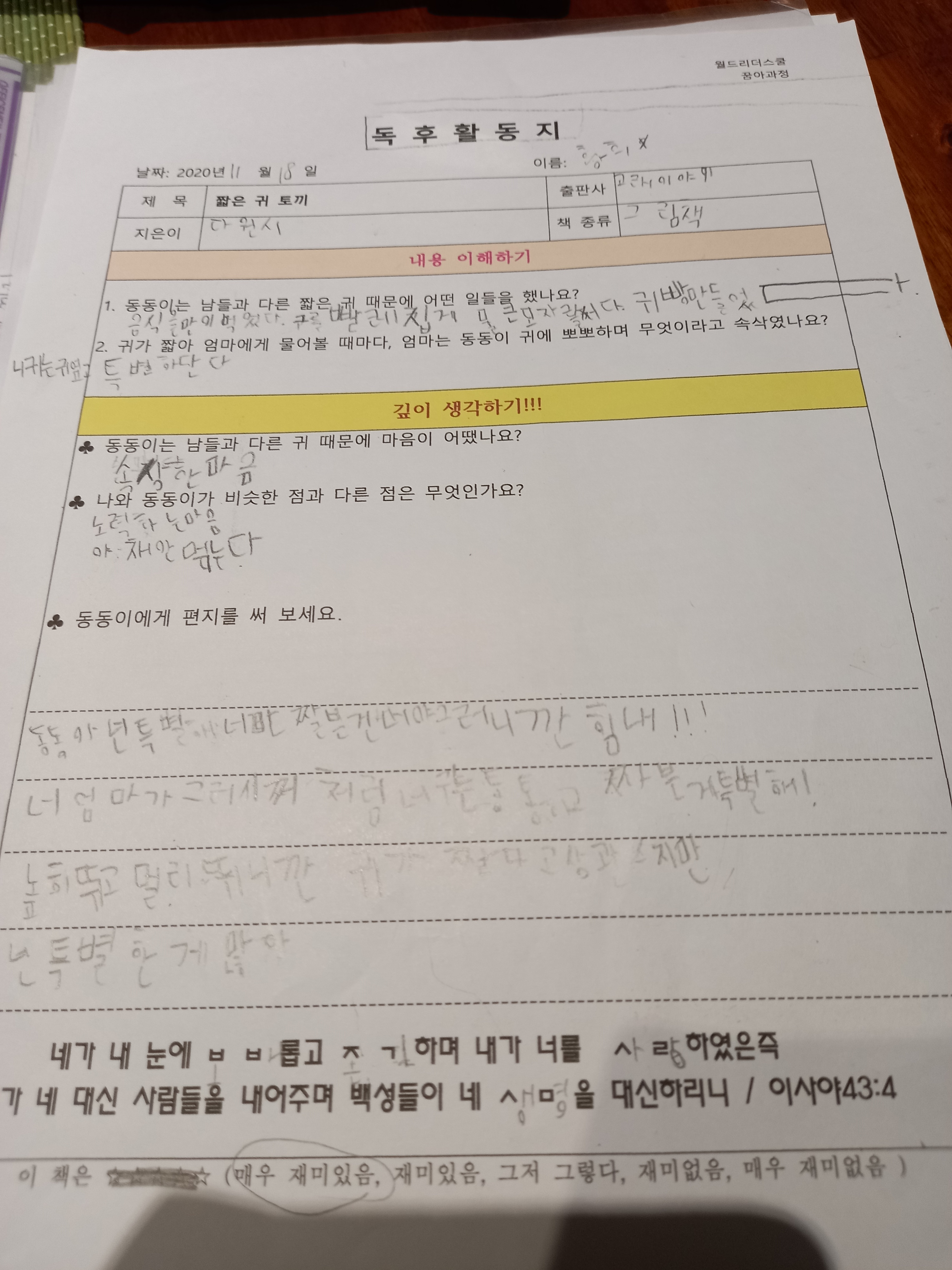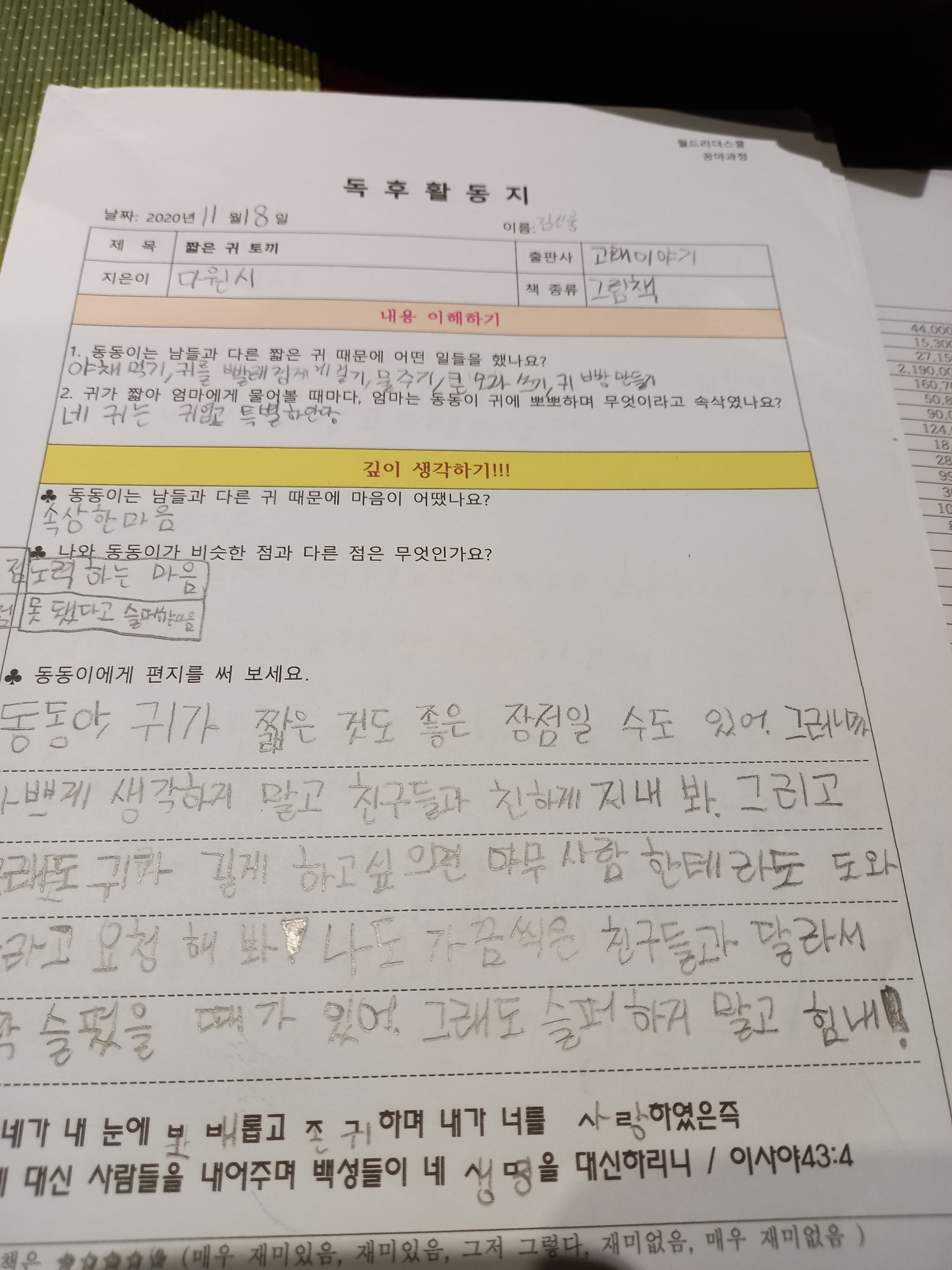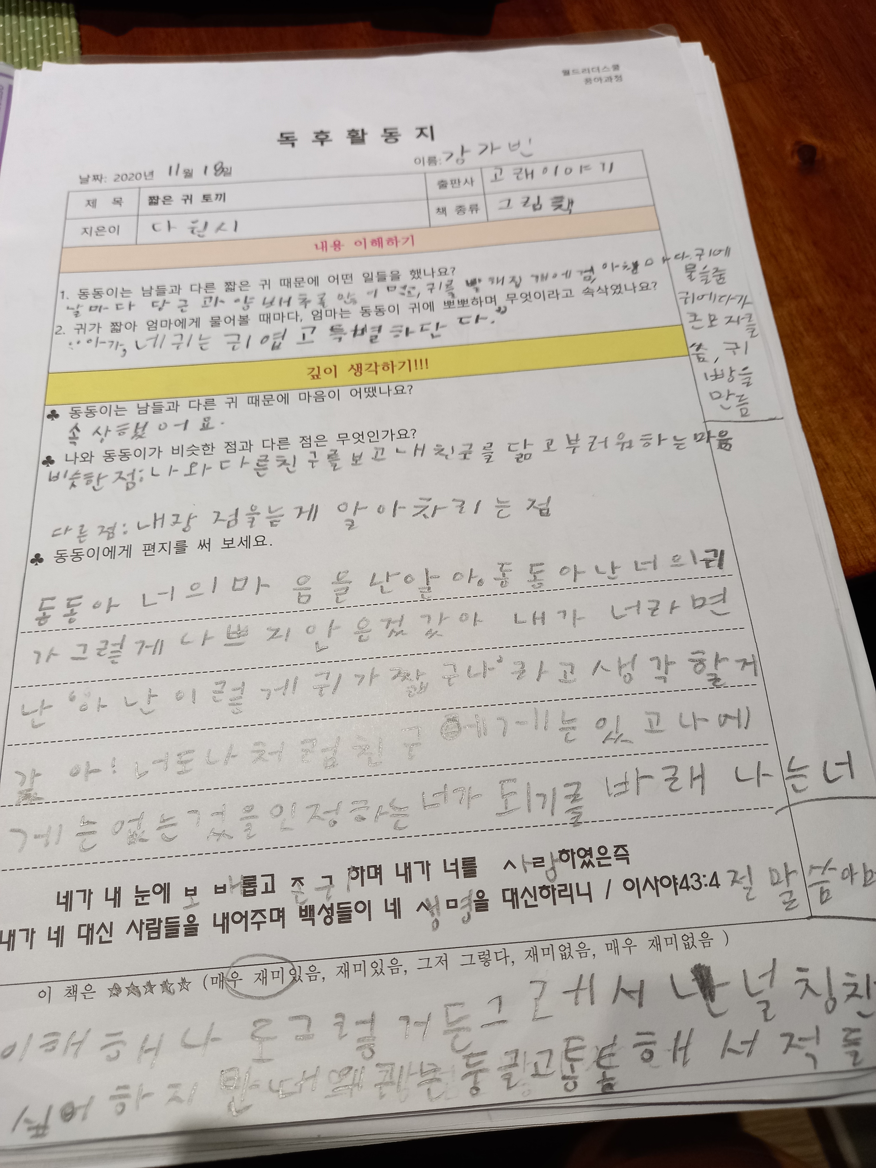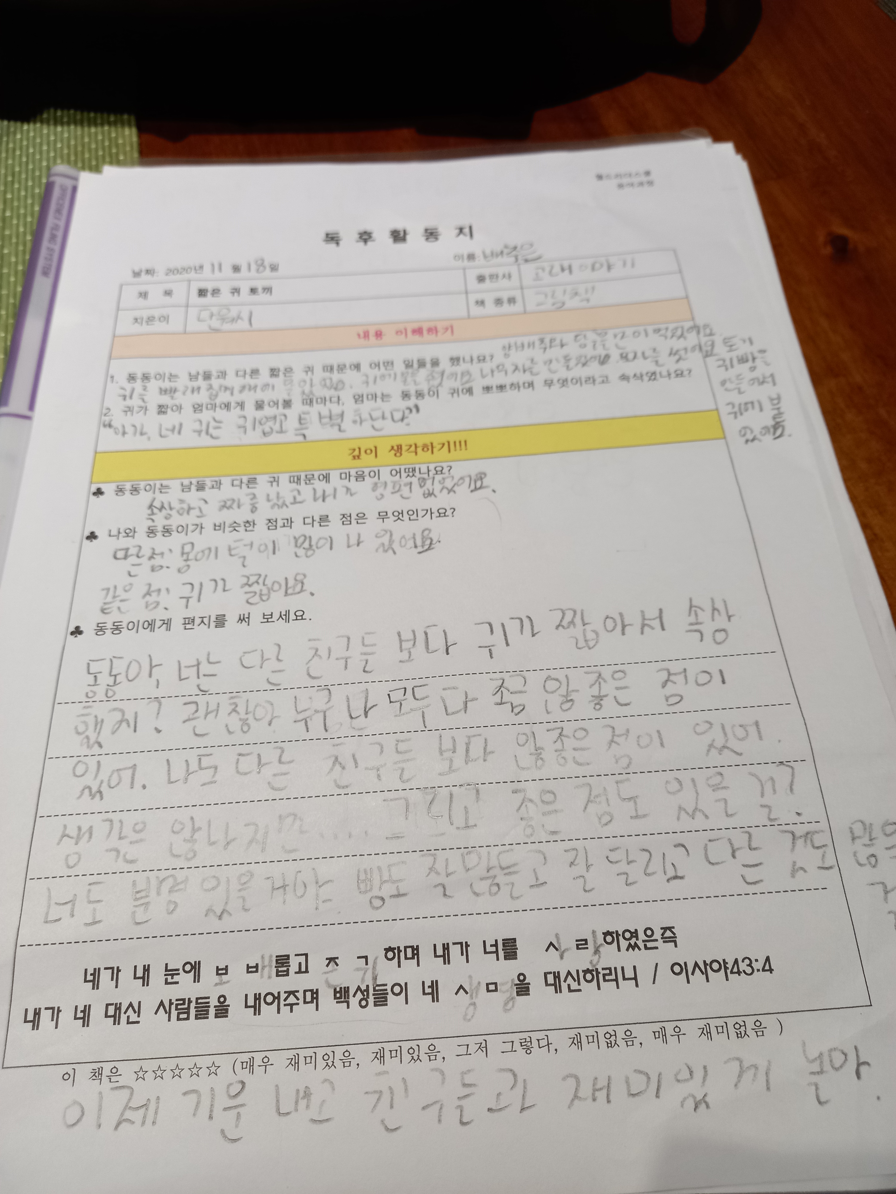 11월18일 꿈아과정<짧은 귀 토끼> 수업활동지 작성자정진순|작성시간20.11.22|조회수403 목록 댓글 0 글자크기 작게가 글자크기 크게가 질문과 감상문 쓰기 다음검색 현재 게시글 추가 기능 열기 북마크 신고 센터로 신고 댓글 댓글 0 댓글쓰기 답글쓰기 댓글 리스트