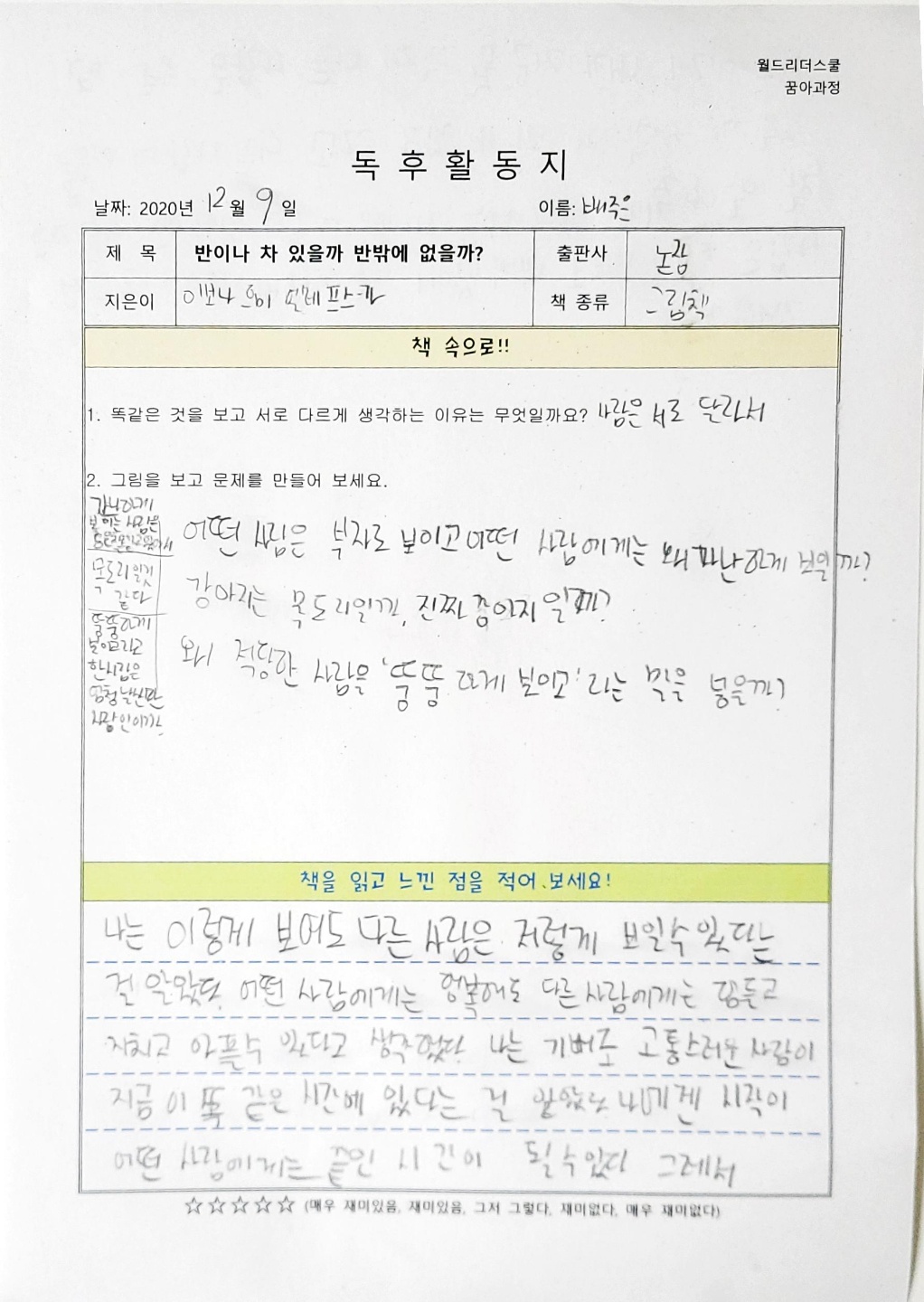 12월9일 꿈아과정<반이나 차 있을까 반밖에 없을까?> 수업활동지 작성자정진순|작성시간20.12.14|조회수219 목록 댓글 0 글자크기 작게가 글자크기 크게가 다음검색 현재 게시글 추가 기능 열기 북마크 신고 센터로 신고 댓글 댓글 0 댓글쓰기 답글쓰기 댓글 리스트