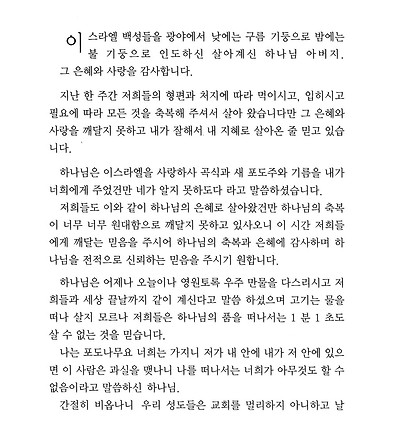 먼저 우리의 영혼을 멸망에서, 우리의 생명을 파멸에서 구원하여 주신 주님께 찬양을 돌리옵니다. 우리의 생명을 주님께로 부터 다시 받았사오니 평생을 주를 위해 살게 하시며, 주의 구원의 은혜를 만방에 선포하며 복 있는 자의 삶을 살아가게 하옵소서. 이 나라와 이 백성을 여러가지 위험과 위기 속에서 구원하여 주셨음을 찬양하옵나이다. 하나님의 보호하심이 없었다면 어찌 이 나라가 적의 위협 속에서 무사 할 수 있었겠습니까. 이제 바라옵기는 백성들로부터 위정자들에 이르기까지 하나님을 경외하며 진실과 정직한 삶을 살게 하옵소서.