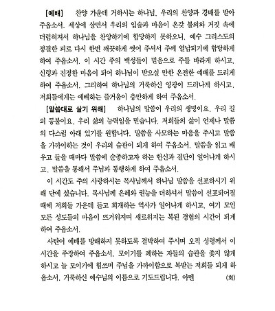 이 시간 말씀을 증거하실 목사님께서도 주의 놀라운 능력으로 함께하셔서 저희들을 신령한 말씀으로 인도하시는데 조금도 부족함이 없는 능력 있는 종이 되게 하여 주시옵소서.