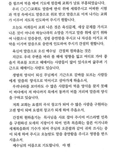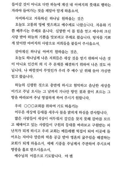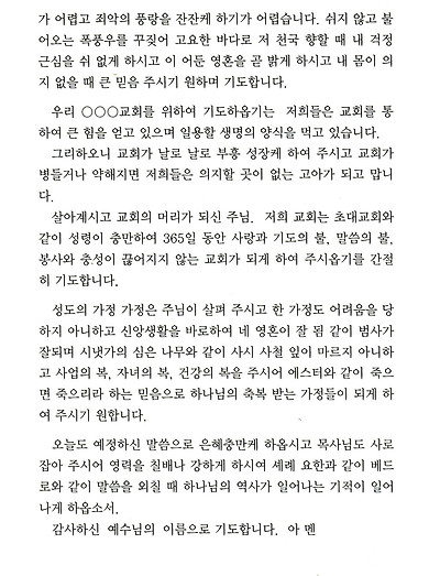 우리나라에 더욱 더 큰 복을 내리시어 평화적인 방법으로 통일케 하옵소서. 그리하여 백두산에서부터 한라산에 이르기까지 마을 마다 하나님을 찬양하는 소리가 우렁차게 들리게 하옵소서. 한국 교회와 우리 00교회를 굽어 살피소서. 하나님의 마음에 합한 교회와 백성들이 되게 하소서. 그리하여 마지막 날 맡겨진 사명을 잘 감당하게 하옵소서. 이 밤에 드리는 우리의 찬양을 아버지여 받아 주옵소서. 예수님의 이름으로 기도드립니다. 아멘 |