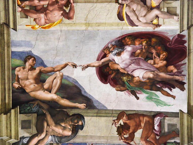 미켈란젤로-천지창조(creation_of_adam).구름과 천사들에 떠받들려 하늘에 부상하는 하나님이 오른손 끝으로