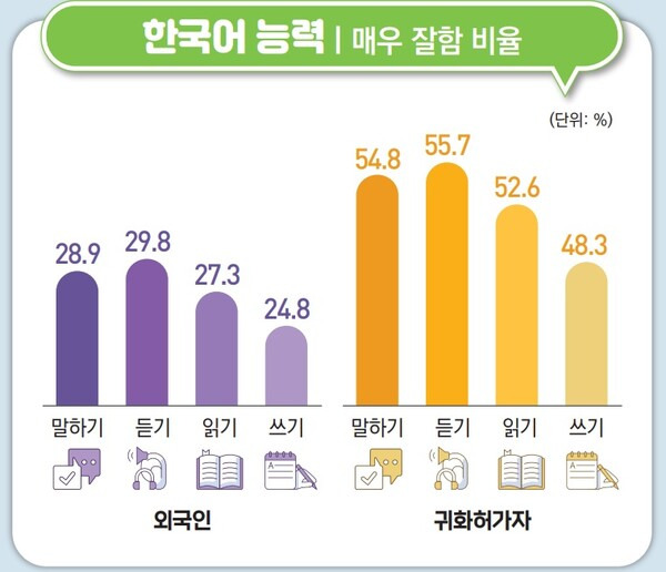 국가데이터처가 18일 공개한 '2025년 이민자 체류 실태 및 고용조사' 결과를 보면 외국인의 한국어 실력은 모든 부문에서 '매우 잘함' 비중이 가장 높았다.