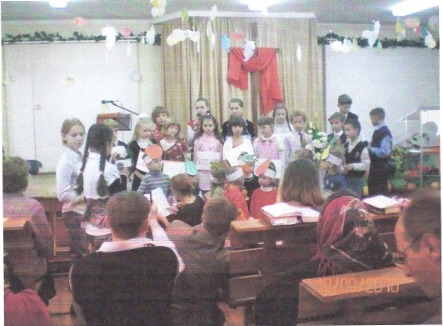 아래의 사진은 젤례즈노다로즈늬 시의 성탄교회 추수감사절 예배시 아이들이 찬양을 하는 장면입니다.