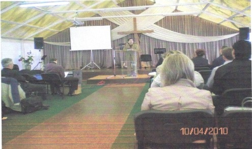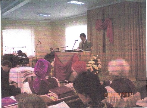 밑의 사진은 젤례즈노다로즈늬시의 성탄교회에서 주일예배 설교하고 있는 변상대 선교사의 모습입니다.