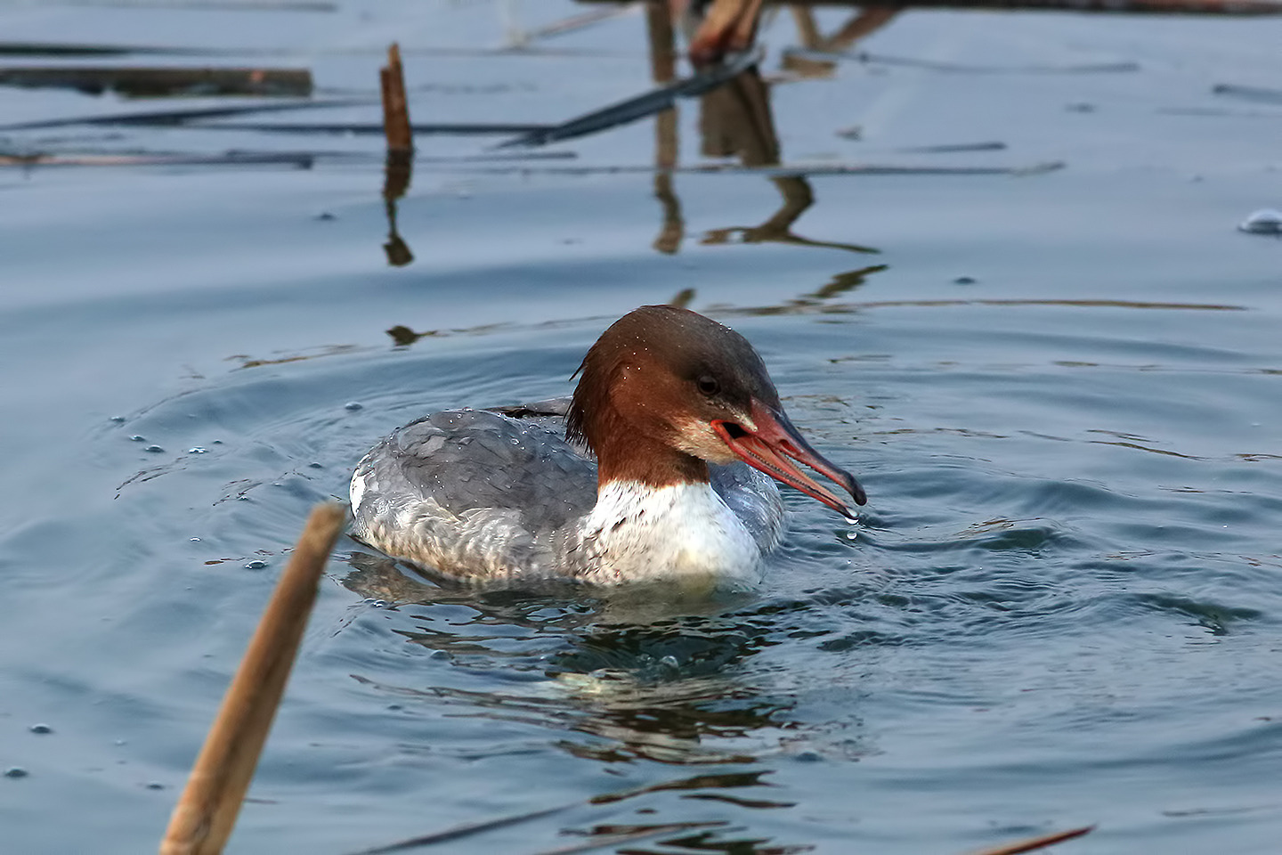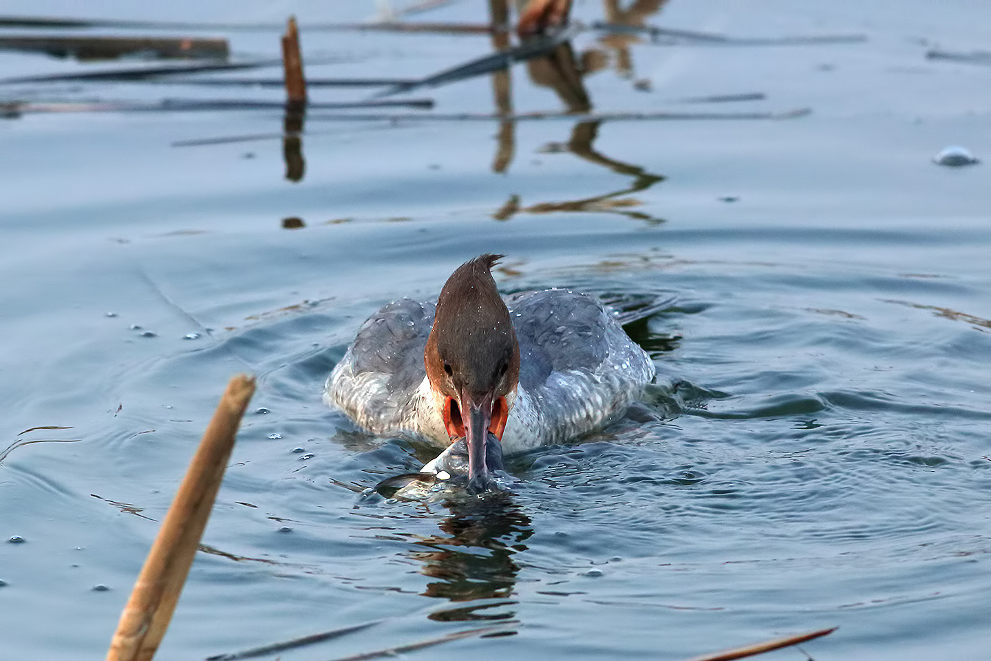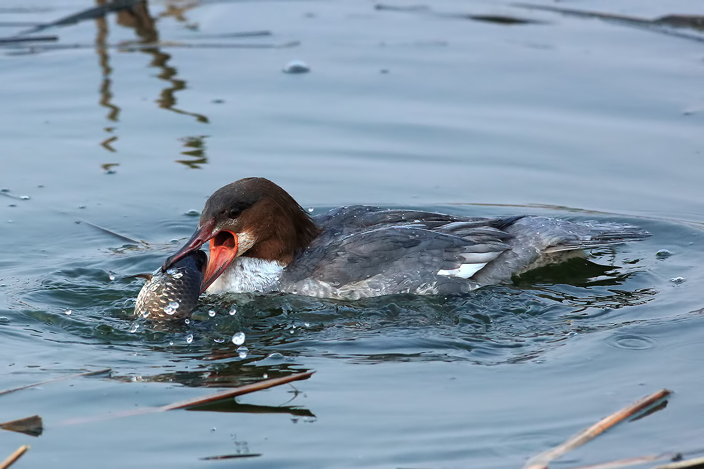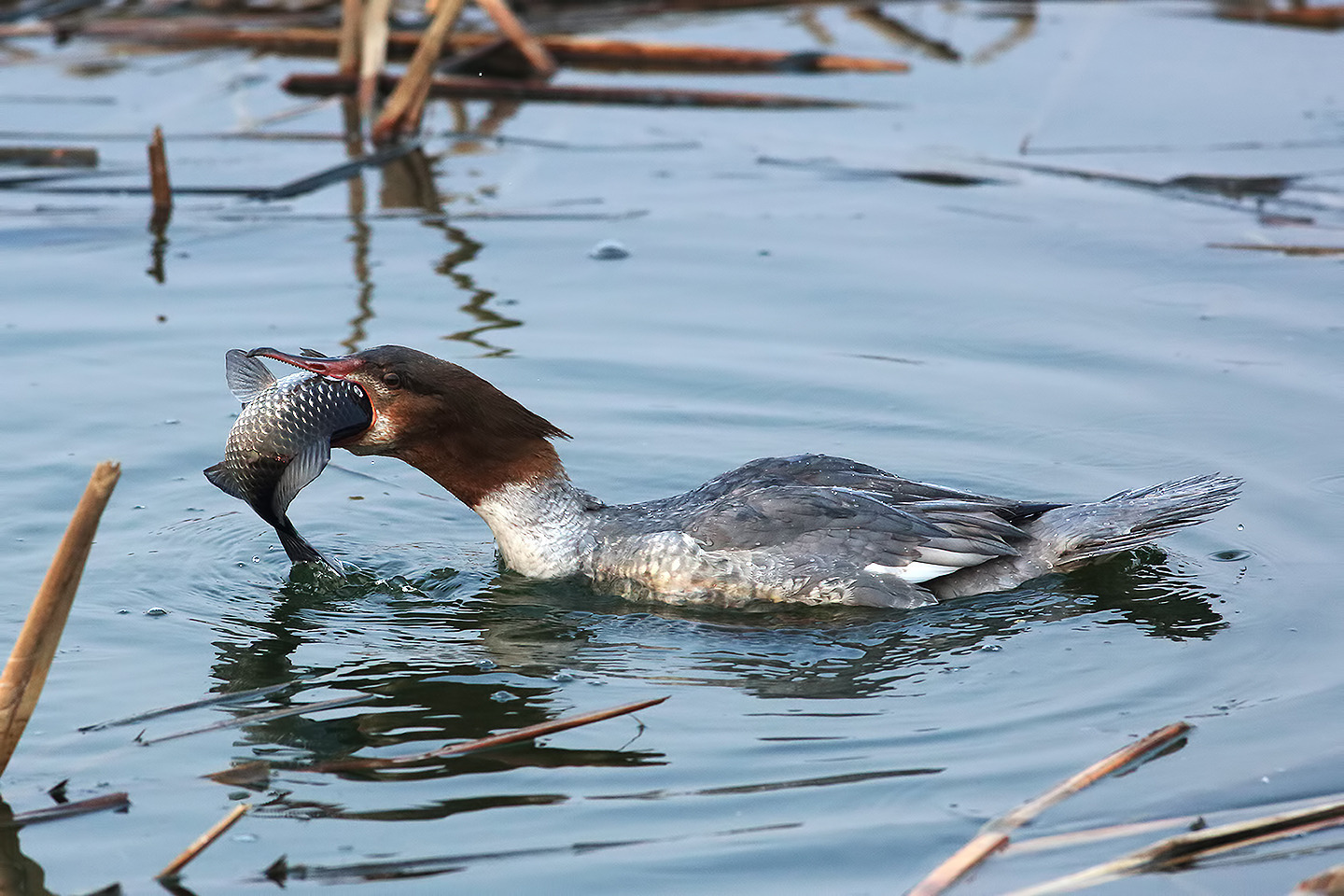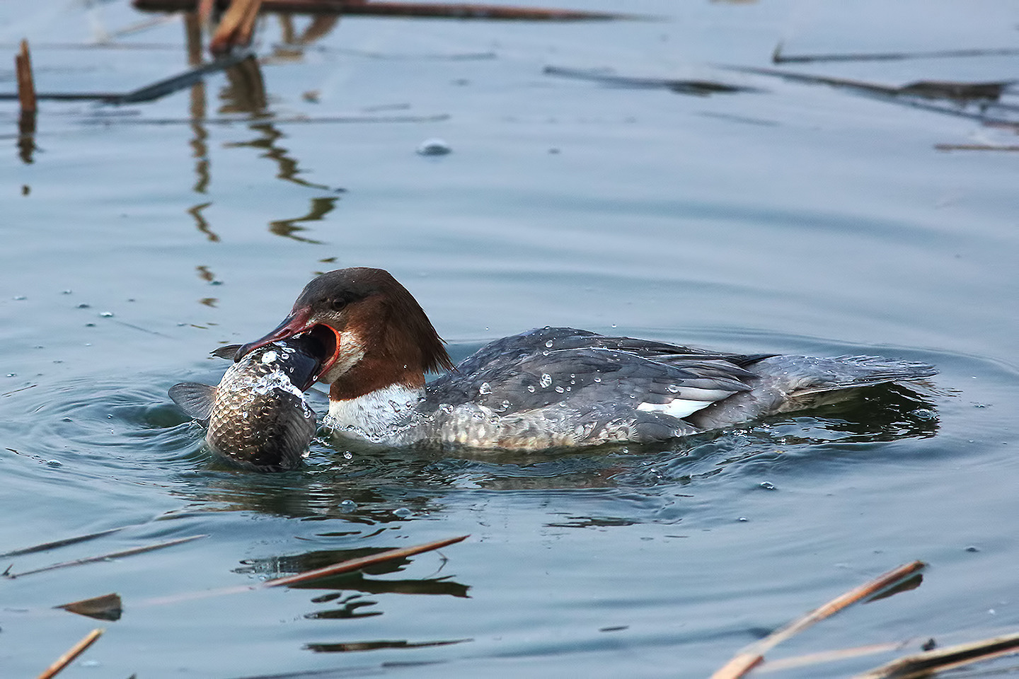 비오리가 커다란 붕어를 잡아 먹다가 너무 커서 먹지 못하고 있어요