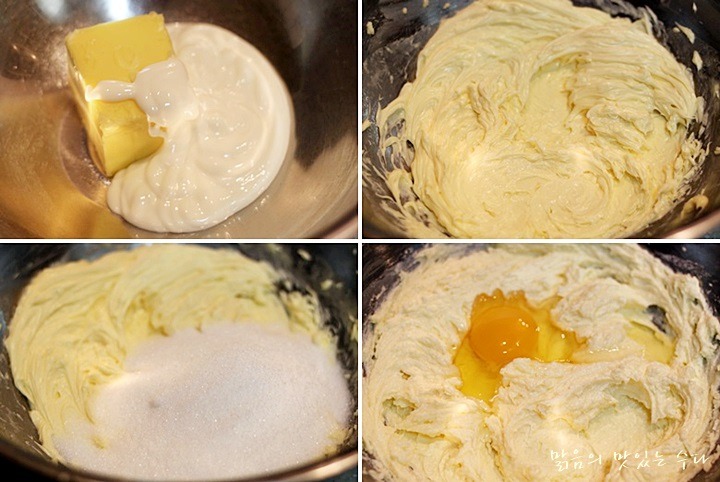 이때 달걀을 한꺼번에 넣으면 버터와 분리될 수 있으니 한개 넣어 분리되지 않게 섞어주고