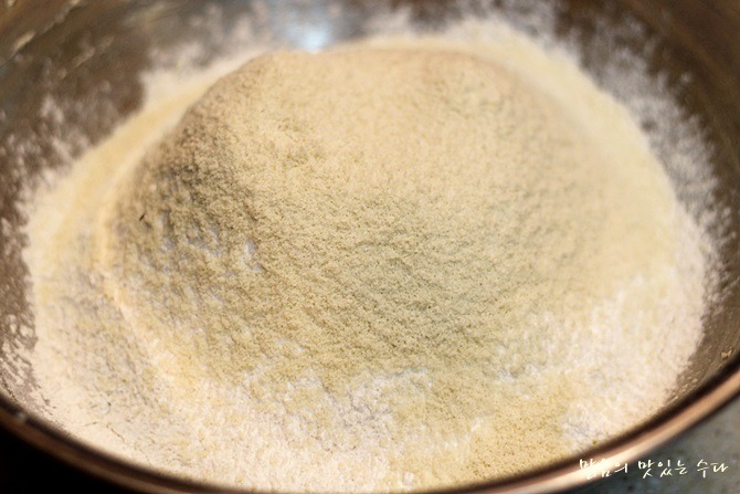 만들어 놓은 버터치즈반죽에 체에 친 밀가루와 아몬드가루를 넣고