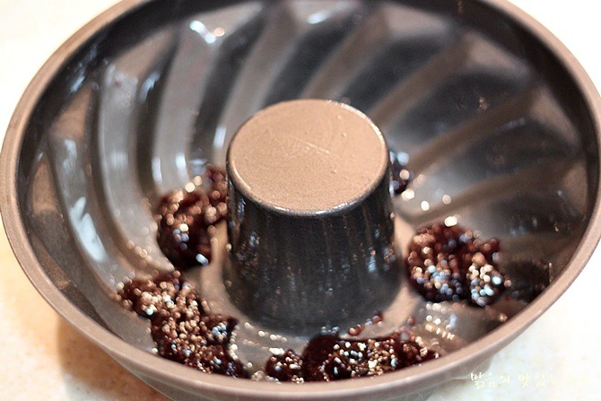 원하는 틀에 포도씨유를 살짝 발라준 뒤 포도잼을 군데군데 넣어 주고 반죽을 부어주었는데...