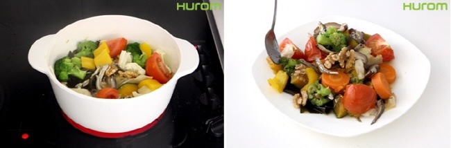 재료(200ml 기준) : 양배추 1/8통, 파프리카 1/2개, 토마토 1개, 브로콜리 1/4송이, 당근 1/2개, 단호박 1/4개, 표고버섯 2개, 멸치 반줌, 다시마 약간, 호두 반줌