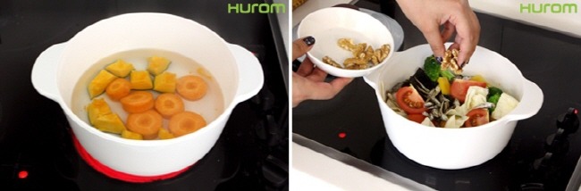 이제 손질한 재료를 물에 넣고 데칠 건데요. 단호박, 당근 등 단단한 채소를 먼저 넣고 데치다가 브로콜리, 파프리카, 양배추, 토마토, 표고버섯, 멸치, 다시마와 호두를 모두 넣고 약 10분간 데쳐주면 돼요.