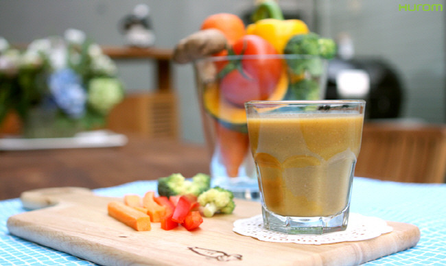 드럼 속에서 재료가 모두 혼합되면 주스캡을 열어 주스를 배출해주세요. 이렇게 클라라 멸치주스 완성! 휴롬지기가 좋아하는 당근과 토마토를 넣었더니 약간 붉은 빛을 띠는데요. 취향에 따라 재료의 비율을 조절할 수 있으니 더 맛있게 먹을 수 있겠죠? ^^