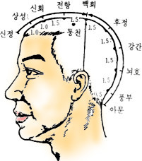 혈 자 리 : 전정혈의 뒷쪽으로 1치 5푼 되는 곳에 있다.