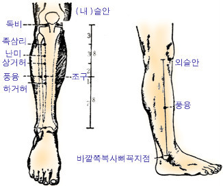 혈 자 리 : 돌비혈에서 아래로 3치 내려가, 다시 굵은정강이뼈 바깥쪽으로