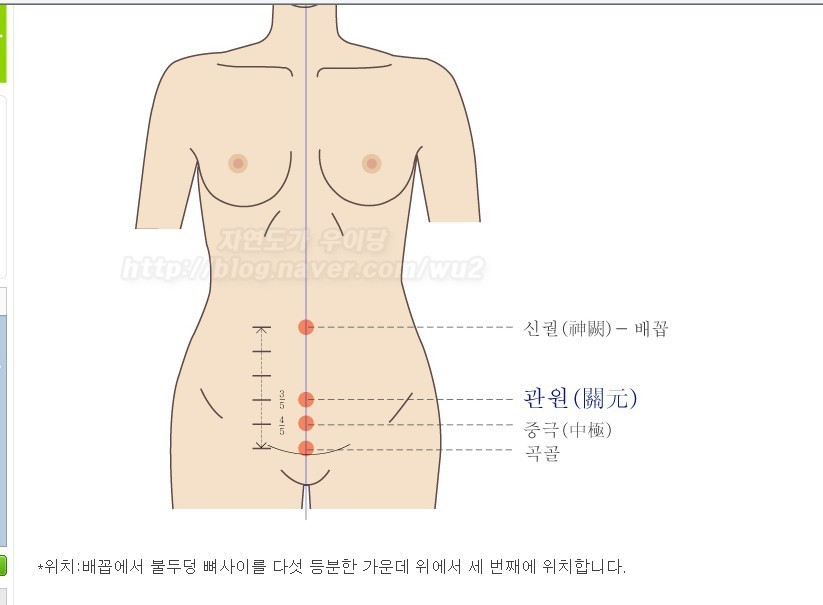 혈 자 리 : 배꼽에서 아래쪽으로 1치 5푼을 내려간 곳에 있다.