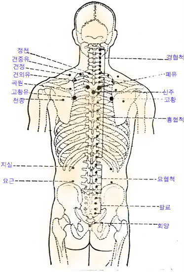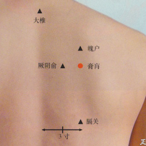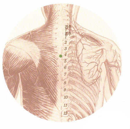 혈 자 리 : 네번째 가슴등뼈 아래에서 양 옆으로 3치를 나간 곳에 있다.