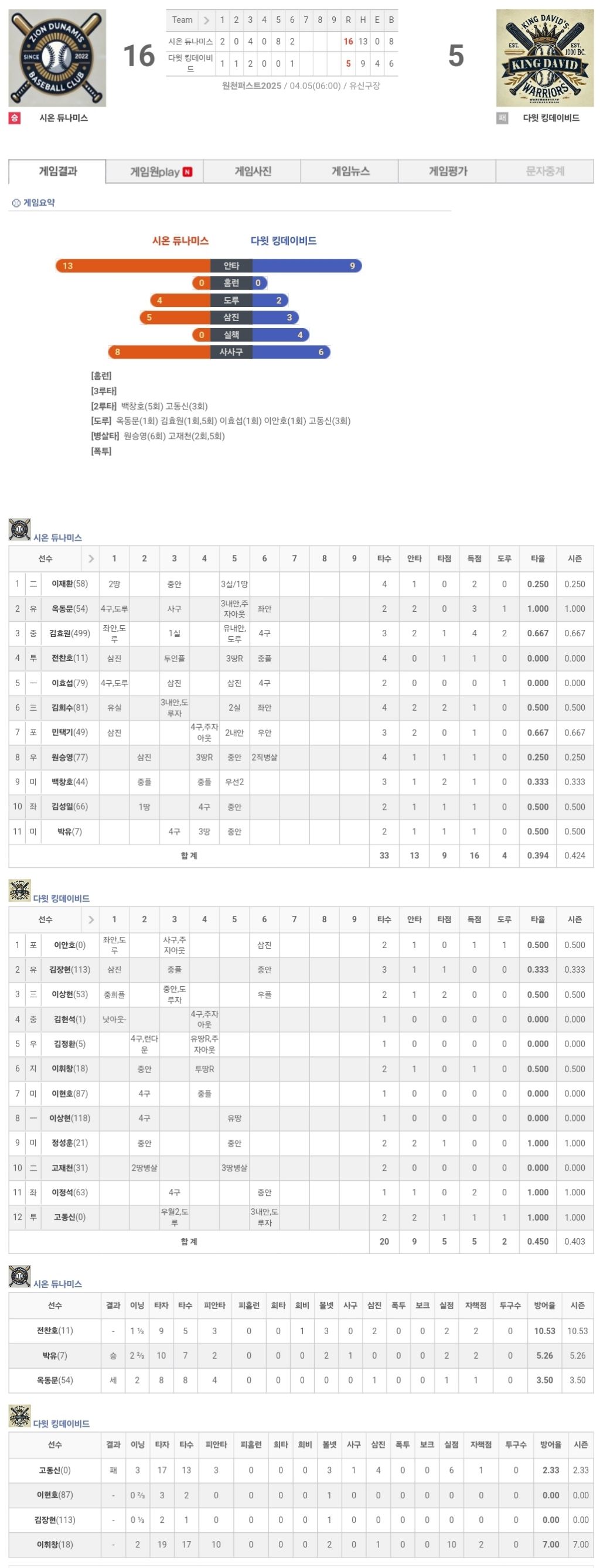 양팀 선수들 모두 수고 많으셨고 3회초,5회초 에러 및 내야안타는 영상 보고 기록원방 심의를 거쳐 최종 반영하겠습니다.