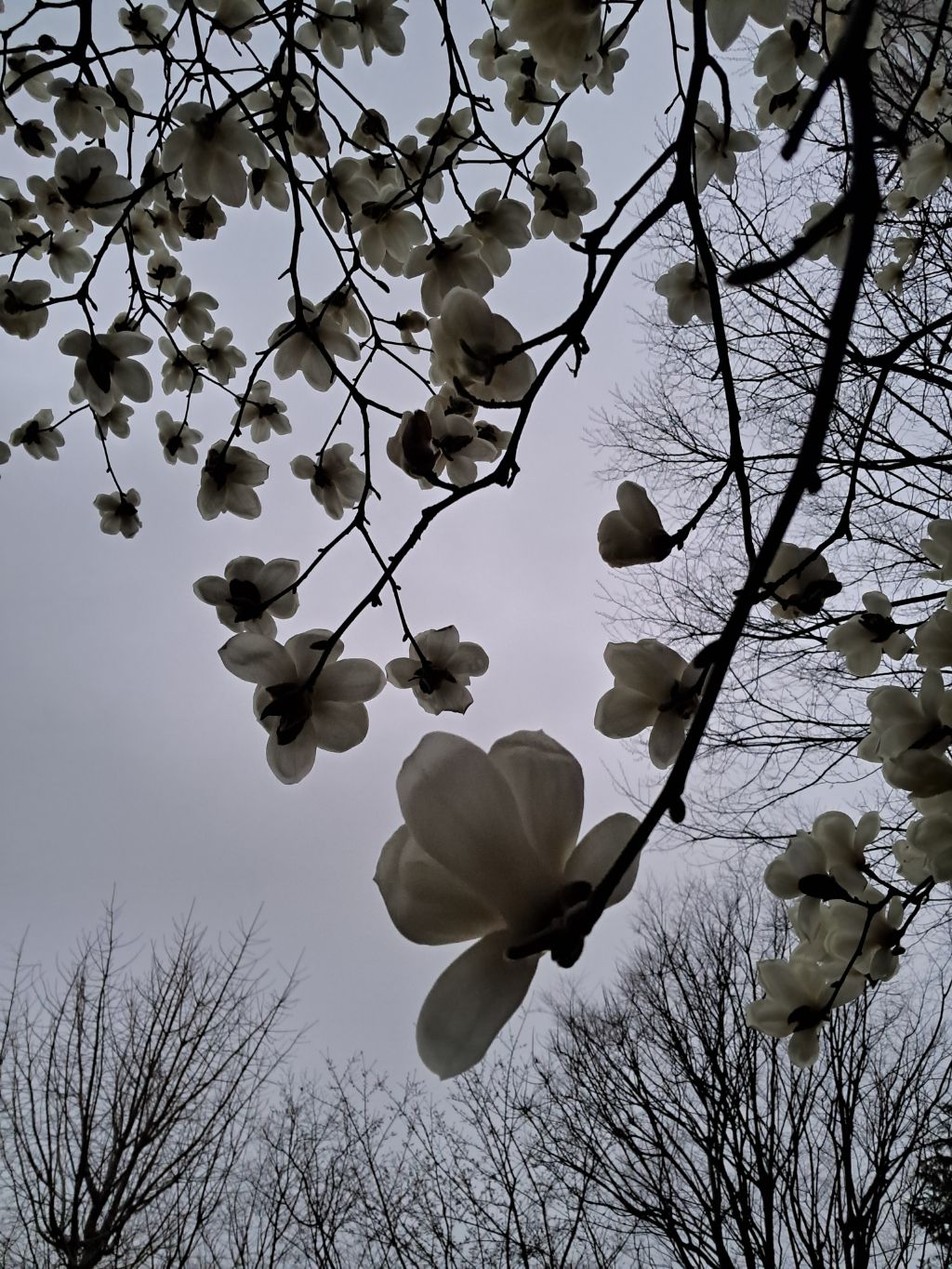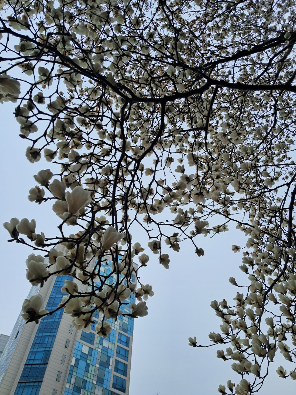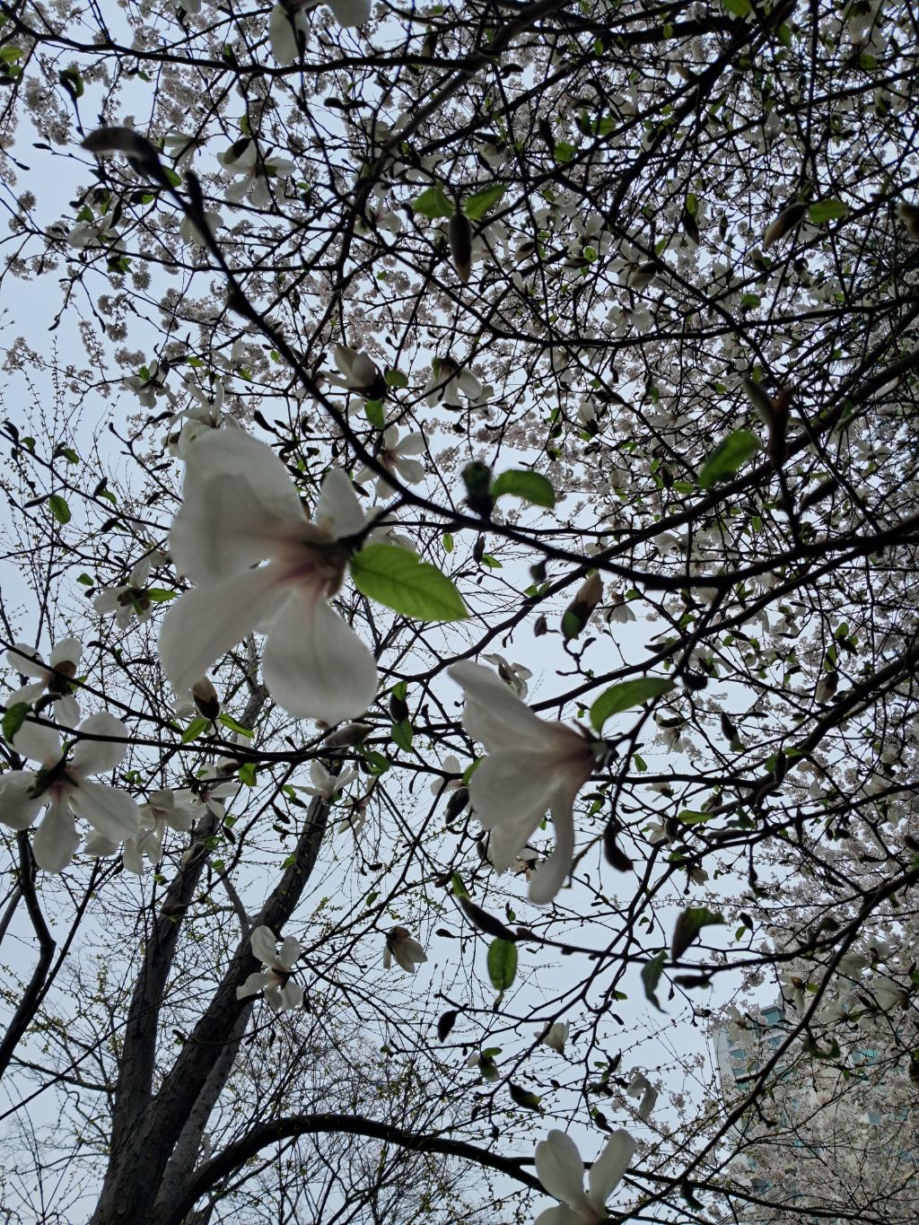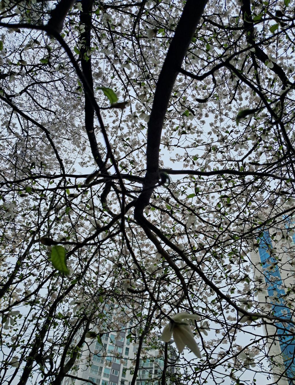 이미 땅에 추락한 갈색 목련 꽃잎들이지만 추운 겨울 뚫고나와 수천수만 송이 푸른 하늘을 짱짱하게 비상하던 장한 목련 꽃송이들.