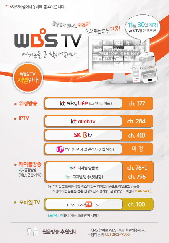원불교텔레비젼(WBS TV) 개국 및 채널번호 안내 작성자조 길제|작성시간15.11.29|조회수91 목록 댓글 0 글자크기 작게가 글자크기 크게가 다음검색 현재 게시글 추가 기능 열기 북마크 공유하기 신고 센터로 신고 댓글 댓글 0 댓글쓰기 답글쓰기 댓글 리스트